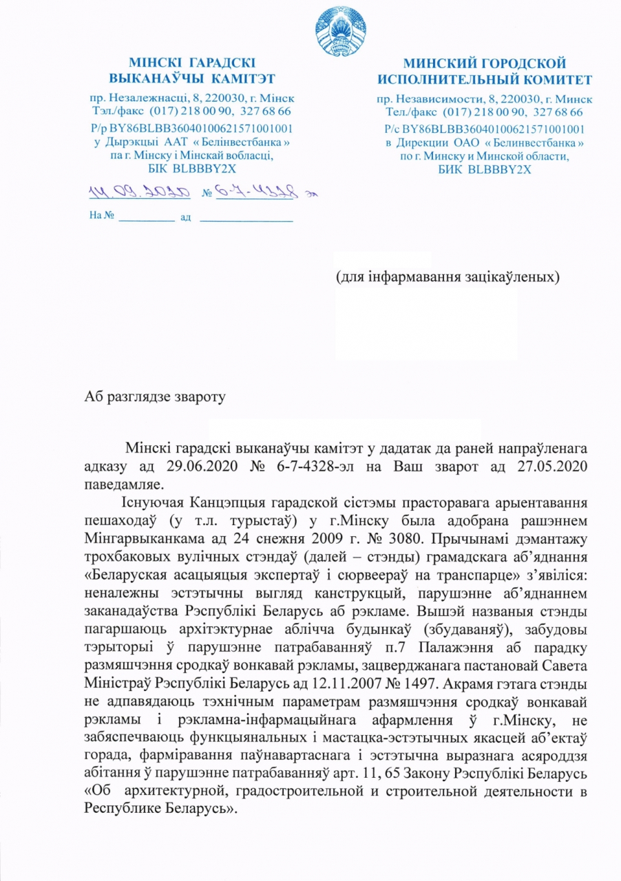 Дадаткова адзначаем, што на інфалініі Менгарвыканкаму, у Камітэце архітэктуры і горадабудаўніцтва Менгарвыканкама, а таксама ў інфармацыйна-турыстычным цэнтры "Мінск" нам не змаглі даць інфармацыю пра далейшы лёс сістэмы арыентавання. Супрацоўніца Камітэта архітэктуры і горадабудаўніцтва Менгарвыканкама ў тэлефоннай размове з першым заяўніком дадзенага звароту выказалася, што былыя інфармацыйныя пункты (трохбаковыя вулічныя стэнды) мелі "страшный эстетический вид", у той жа час, напрыклад, падпісчыкі Telegram каналу "Стужка - Беларусь" выказалі 100% згоду, што былая сістэма арыентавання разам з інфармацыйнымі пунктамі (трохбаковымі вулічнымі стэндамі) была годнай нашай еўрапейскай сталіцы, вынікі адпаведнага апытання маюцца ў першага заяўніка дадзенага звароту.