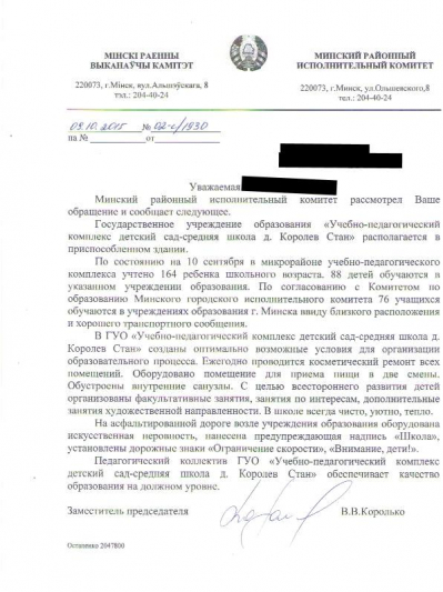 При наличии вышеперечисленных условий, после ввода в эксплуатацию новой школы в д.Королёв Стан, полагаем, большинство детей будет обучаться по месту, что в свою очередь снизит нагрузку на школы г.Минска, где обучаются дети деревни. Кроме этого, снизится нагрузка на общественный транспорт, а также улучшится физическое состояние учащихся при наличии площадок, где можно будет заниматься футболом или хоккеем вне учебного процесса на базе факультатива.