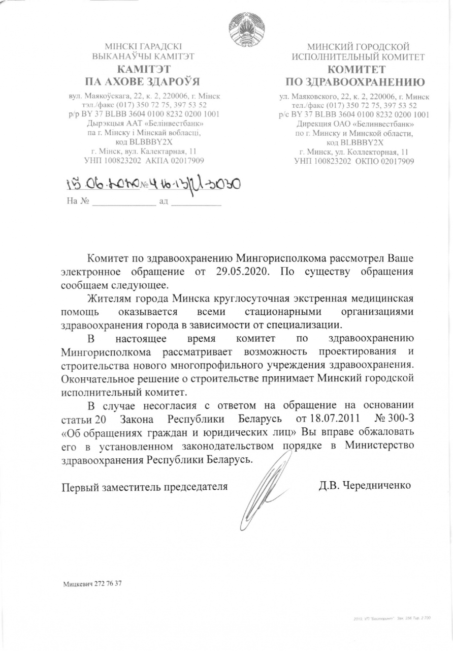 В соответствии с пп.11.4 и пп.11.5 п.11 Положения о комитете по здравоохранению Минского городского исполнительного комитета комитет в соответствии с возложенными на него задачами осуществляет функции разработки мер по рациональному использованию ресурсов: коечного фонда, лекарственных средств, медицинской техники, кадров и других, контроля за эффективным использованием капитальных вложений и планированием строительства новых объектов, а также разработки и осуществление мер по обеспечению доступности высококвалифицированной специализированной медицинской помощи.