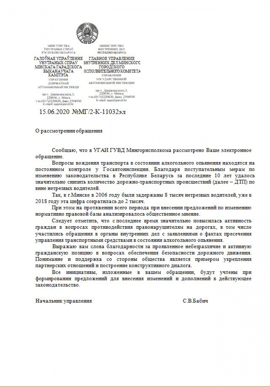 Предложение данное петиции, адресованной руководству Министерства Внутренних Дел Республики Беларусь и Министерству Юстиции Республики Беларусь состоит в том, чтобы: уменьшить наказание за нахождение за рулем в нетрезвом виде, ввести градацию нарушения. Наказывать лишением водительских прав от 1 года до 3 лет. В зависимости от конкретной ситуации. Отменить пункт закона, по которому граждан лишают права управления транспортными средствами за управление в нетрезвом виде селькозозяйственной и бытовой техникой за управление которой вообще не нужно какое-либо удостоверение(мотоблоки, газонокосилки и т.д.) И увеличить наказание за дорожно-транспортные происшествия со смертельным исходом или с нанесением тяжкого вреда здоровью до 15 лет лишения свободы.