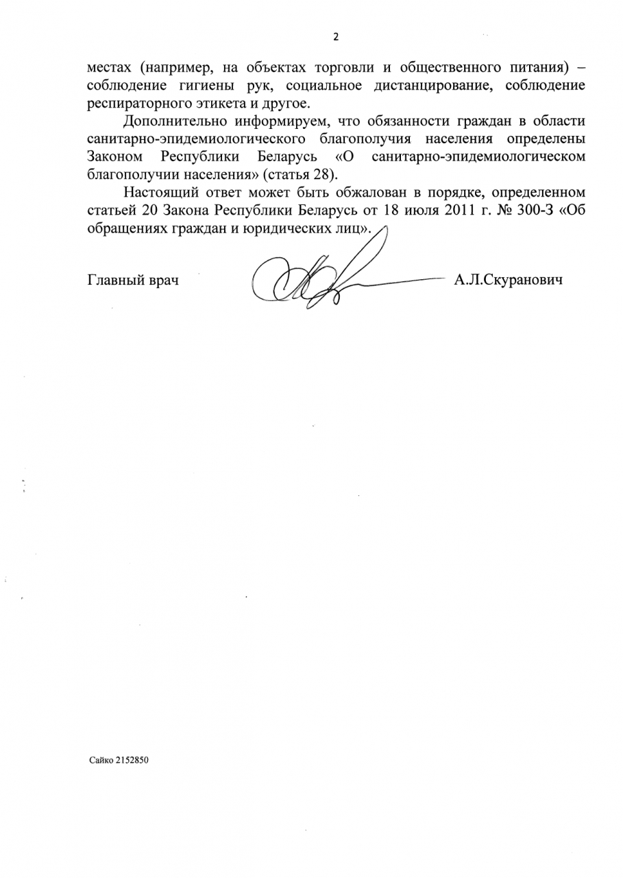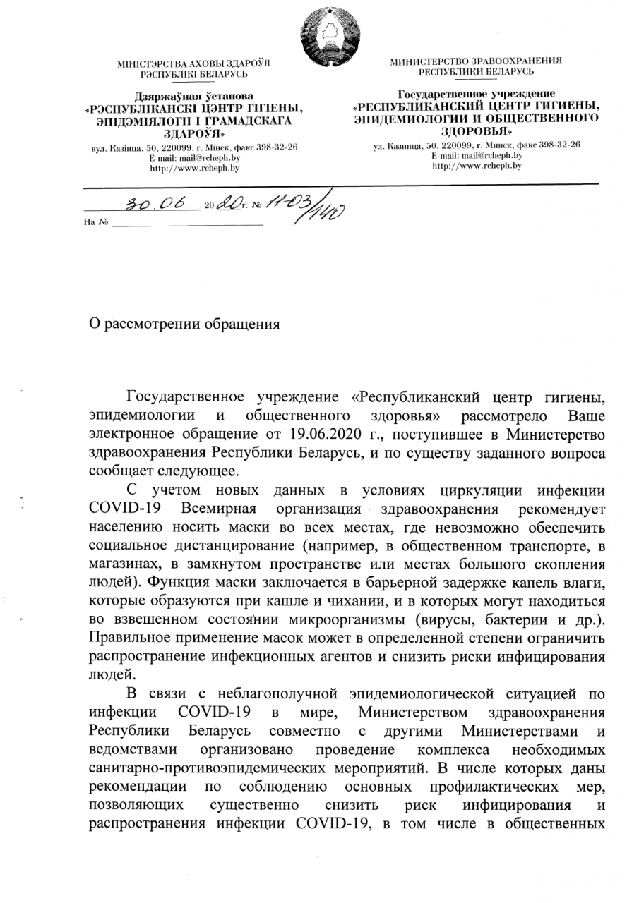 Просим учесть, что согласно ст. 25 Декларации Прав Человека; ст. 21 п. а), п. b), ст. 61 Устава ВОЗ; ст. 45 Конституции Республики Беларусь; ст. 3, ст. 28 Закона Республики Беларусь «О здравоохранении» обеспечение и ответственность за безопасность жизни и здоровья граждан полностью лежит на правительстве (государстве), согласно выше указанным статьям.