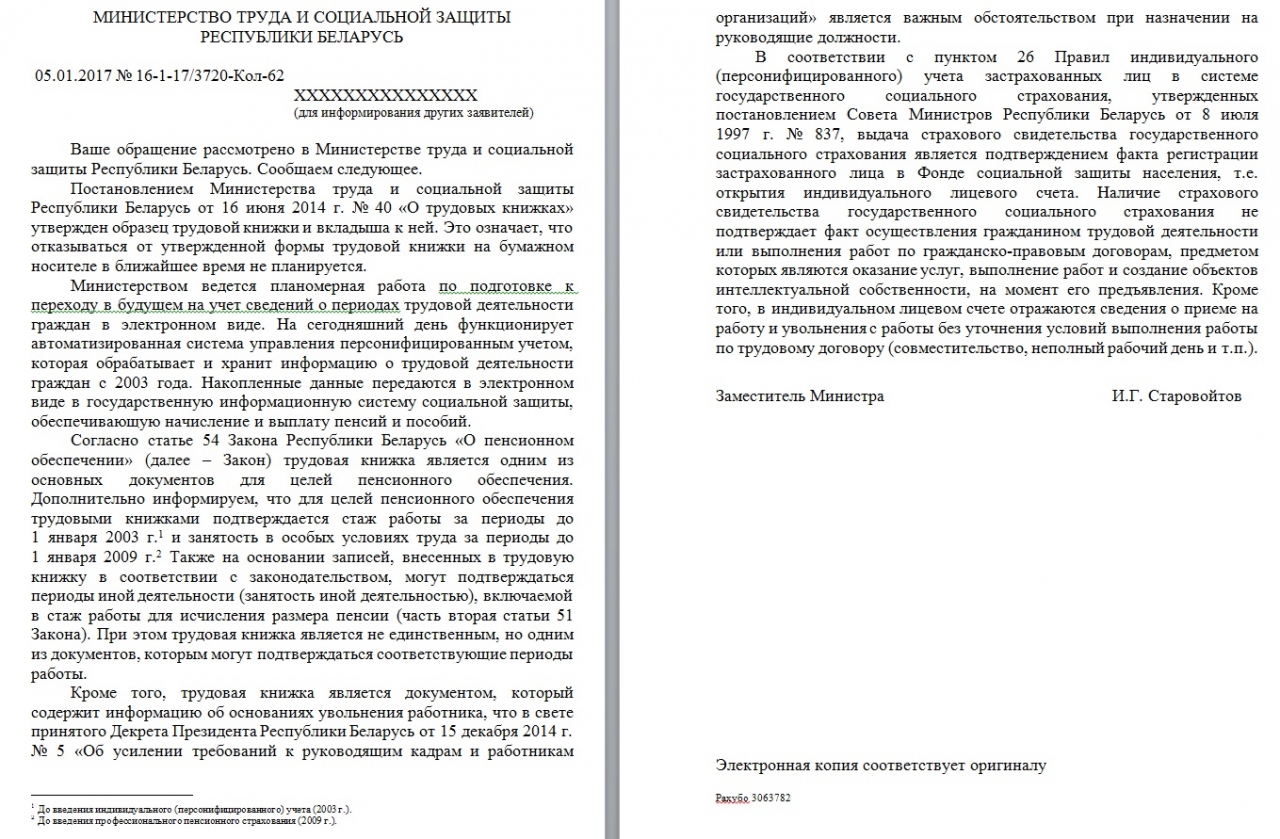 В связи с чем просим государственные органы предоставить обоснованный и мотивированный ответ, планируется ли в Республики Беларусь упразднение повсеместного использования трудовых книжек.