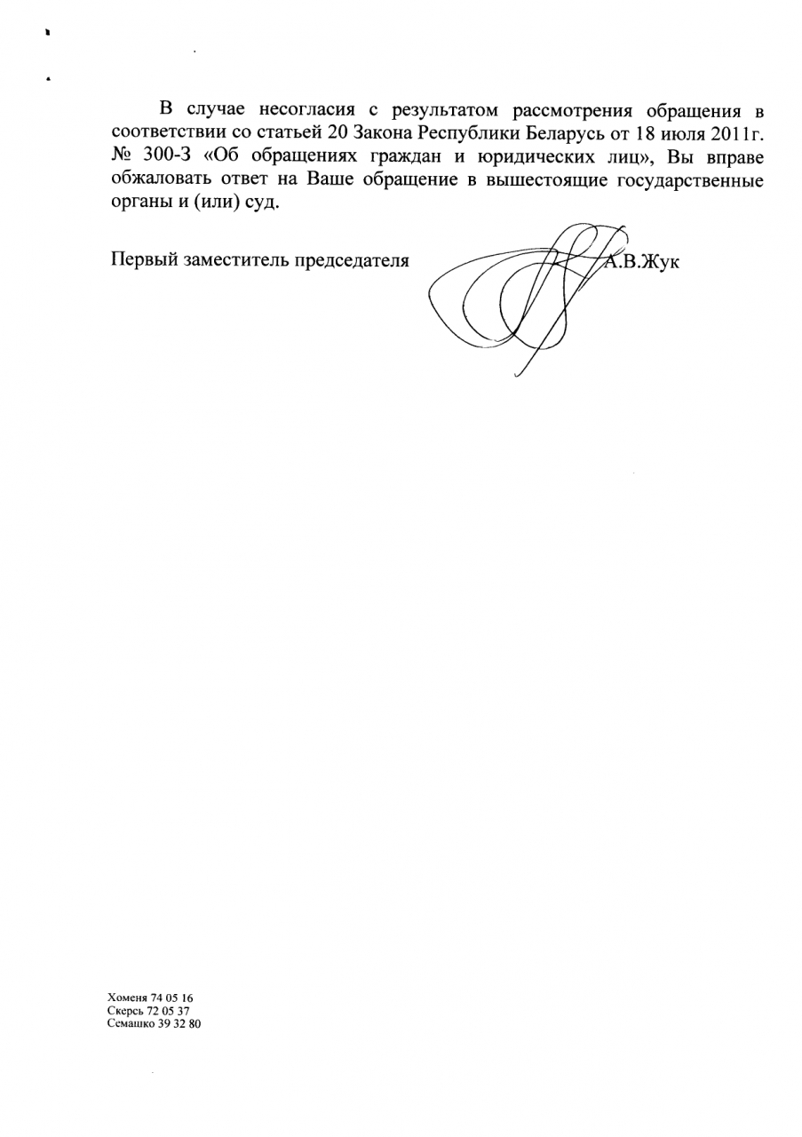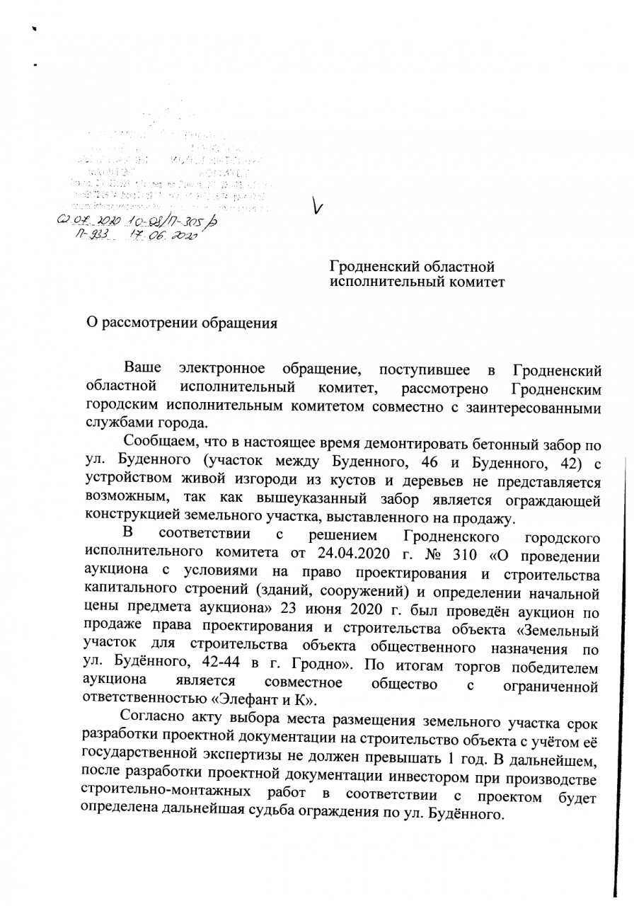 28 мая 2020 г. мною получен ответ Гродненского горисполкома на электронное обращение (копия прилагается) о демонтаже забора на ул.Будённого. Указанный ответ я считаю не соответствующим требованиям законодательства в части полного, всестороннего и объективного рассмотрения обращений и направления мотивированных и обоснованных ответов гражданам по следующим причинам: