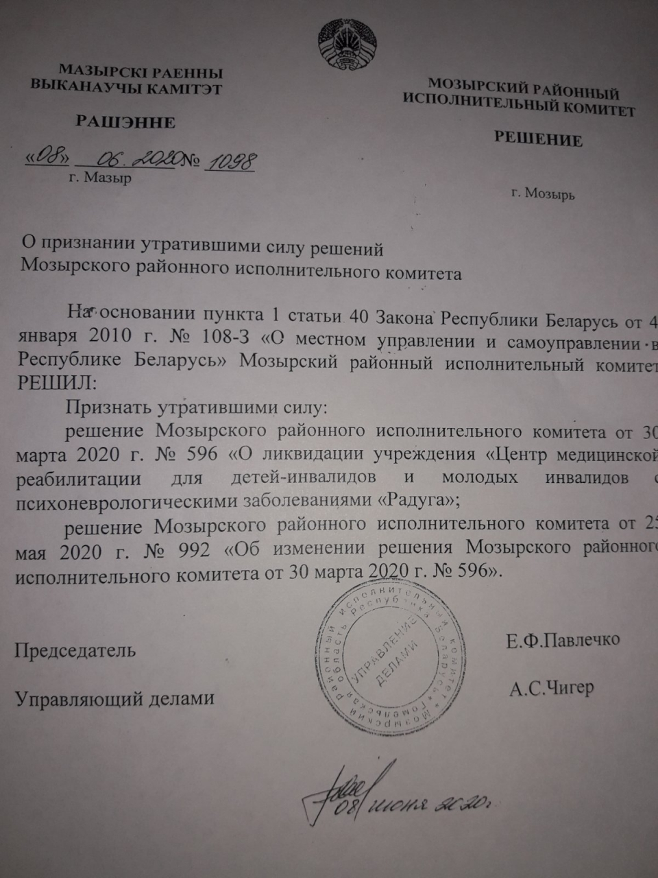 Разам з тым рашэннем Мазырскага раённага выканаўчага камітэта прынята рашэнне аб унясенні змяненняў у рашэнне аб ліквідацыі цэнтра "Радуга" ў частцы адтэрміноўкі ліквідацыі да 01 кастрычніка 2020 года.