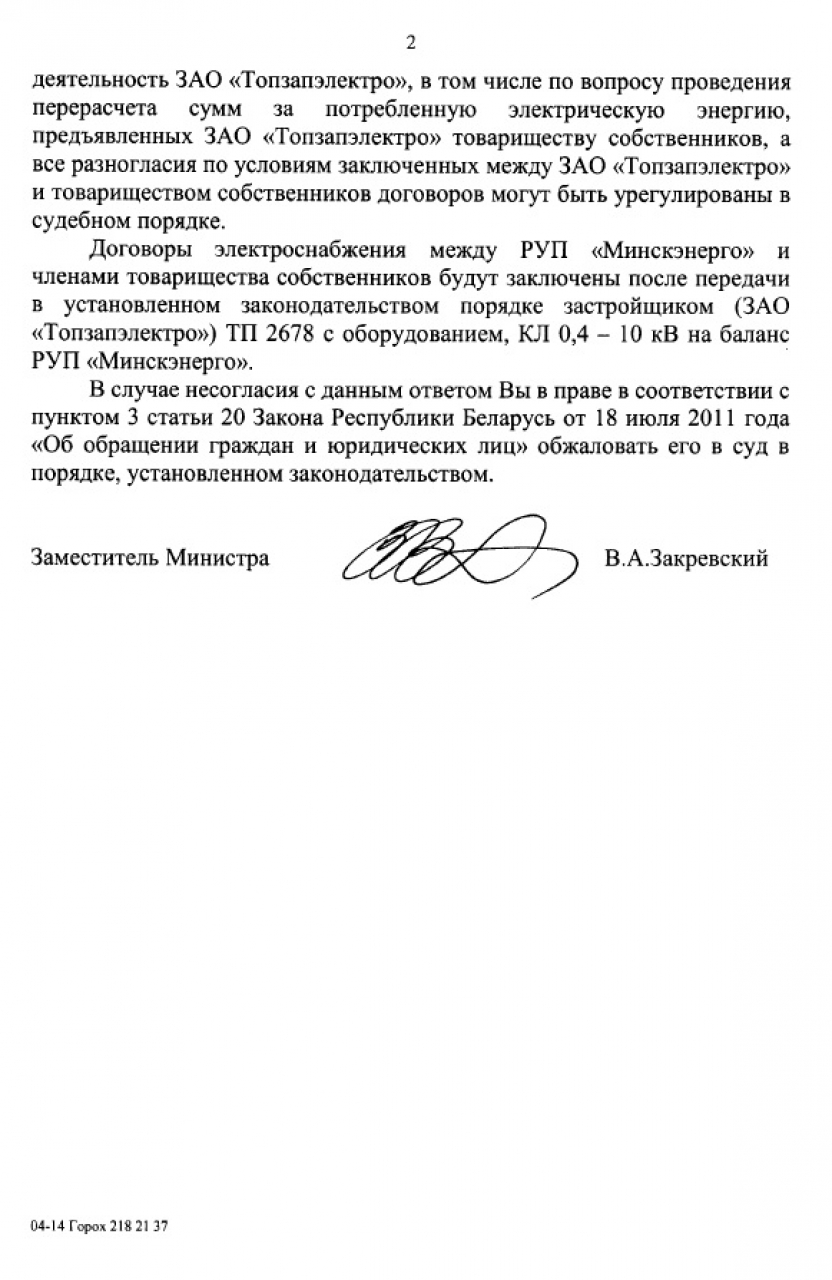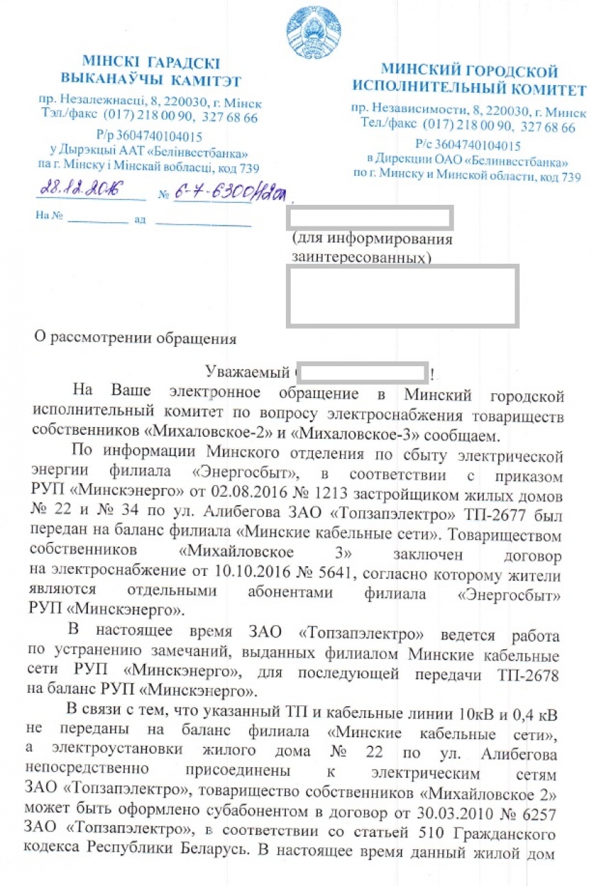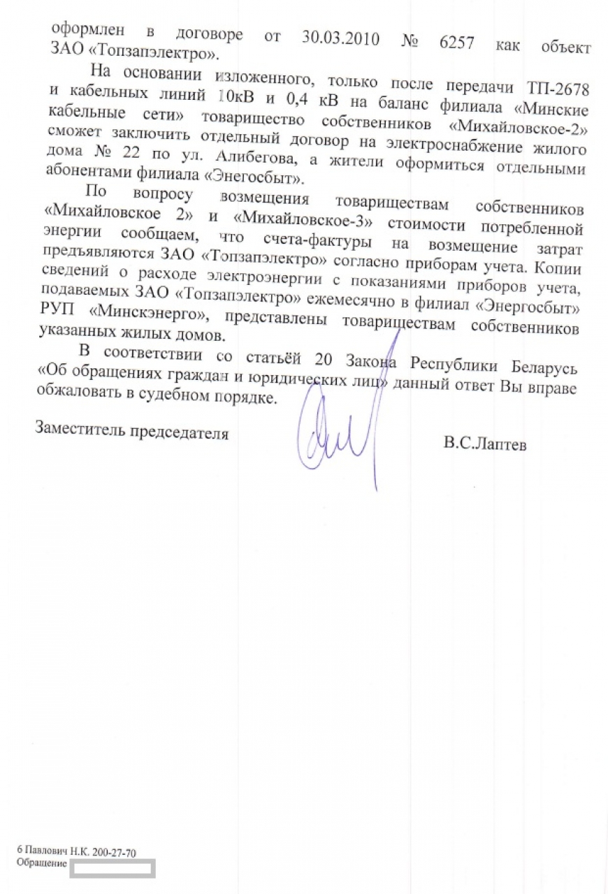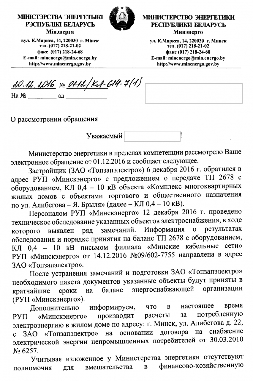 Поскольку потребление электроэнергии в нашем случае осуществляет население в бытовых целях, население не является абонентом, субабонентом (арендатором), население жилых домов обязано ОПЛАЧИВАТЬ потреблённую энергию по приборам поквартирного учёта и приборам учёта мест общего пользования жилого дома. Застройщик ЗАО Топзапэлектро, с марта 2016 года ввода дома 22 по ул. Алибегова, г. Минск в эксплуатацию по своей вине не может передать ТП 2678 в РУП Минскэнерго, свои технологические затраты застройщик не вправе перекладывать на население. Просим принять меры по восстановлению и защите законных прав граждан, произвести перерасчёт оплаты потреблённой электроэнергии населением по приборам учёта за период ввода дома в эксплуатацию по настоящее время, без выставленных затрат застройщика. Определить сроки передачи ТП 2678 в РУП Минскэнерго и сроки для заключения прямых договоров с населением не позднее 01.01.2017 года.
