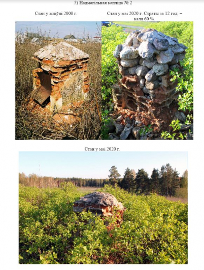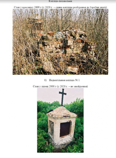 У матэрыяльнай гісторыка-культурнай каштоўнасці “Комплекс старых праваслаўных могілак XIX ст.” адсутнічае пашпарт, з дапамогай якога можна было б суаднесці перамешчаныя надмагіллі з месцамі пахаванняў. Акрамя гэтага, на пагорку, які згодна з мапамі канца 19 – пач. 20 ст., знаходзіцца ў цэнтры могілак 19 ст., разбураюцца рэшткі мураванай мігілкавай капліцы, а таксама двух цагляных надмагілляў, адно з якіх яшчэ ў 2009 г. было цэлым, а сёння напалову руініраванае, а другое цалкам знішчана.