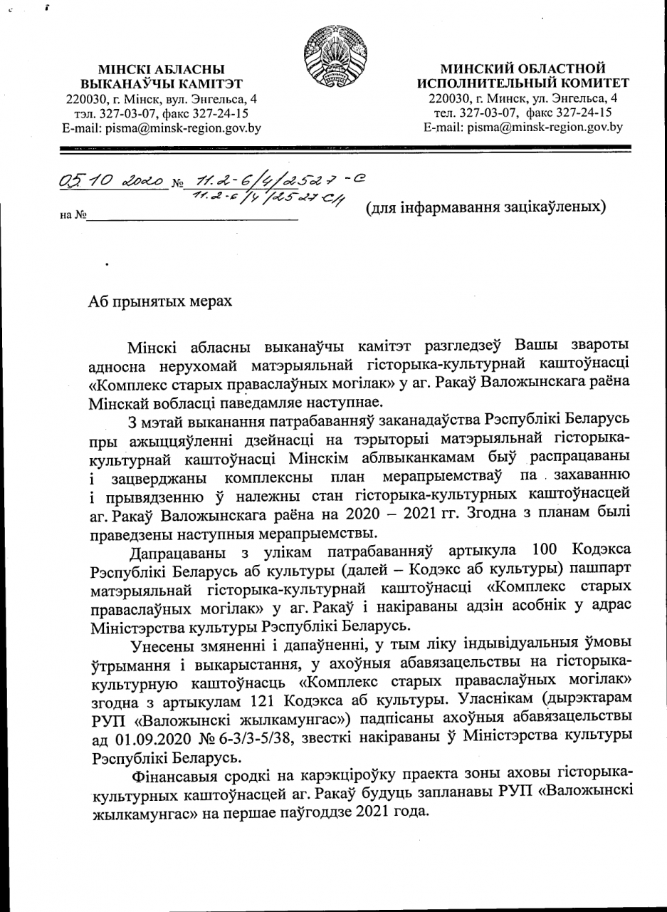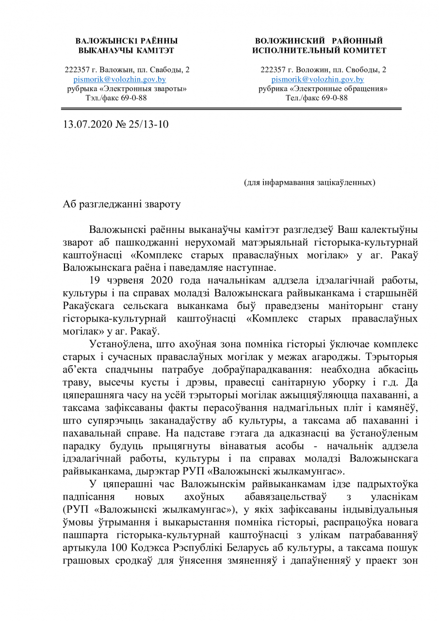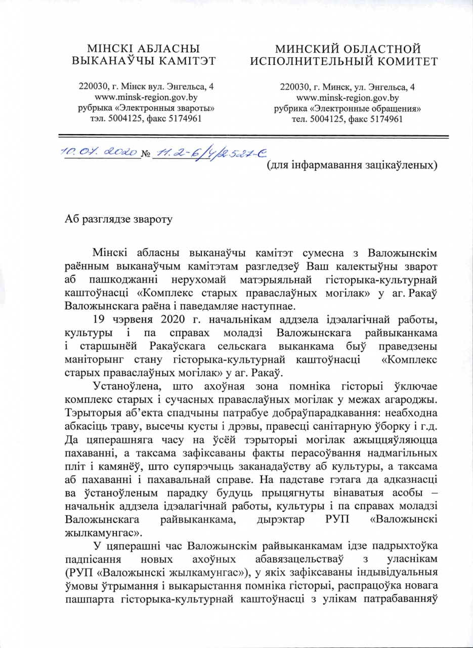 Мінскаму аблвыканкаму сумесна з Валожынскім райвыканкамам даручана ажыццявіць праверку выкладзеных у звароце фактаў, у выпадку выяўлення парушэнняў закадаўства ў адпаведнасці з артыкуламі Працэсуальна-выканаўчага кодэкса аб адміністрацыйных правапарушэннях разгледзець пытанне аб прыцягненні адказных асоб да адказнасці ва ўстаноўленным парадку, а таксама арганізавацаь комплекс мерапрыемстваў па захаванні гісторыка-культурнай каштоўнасці.