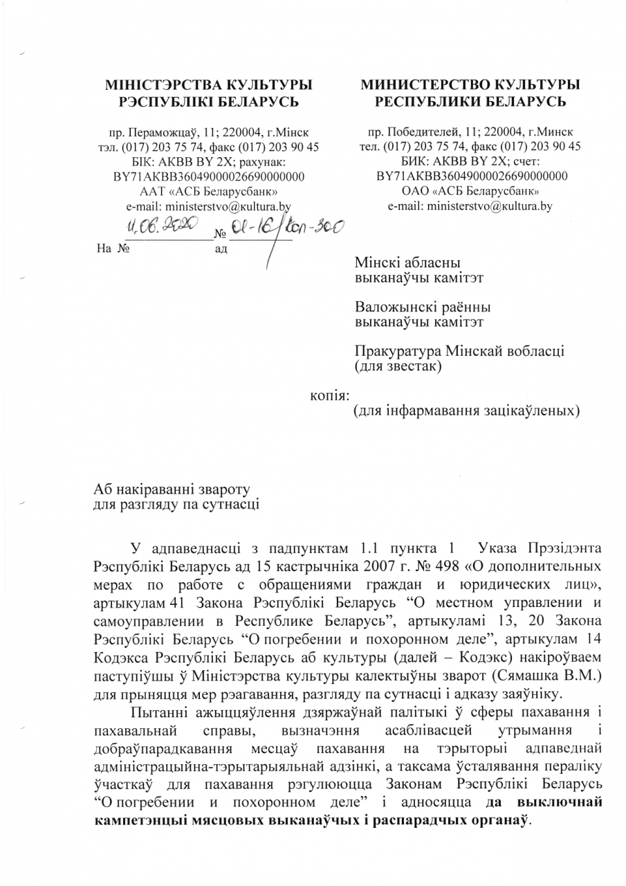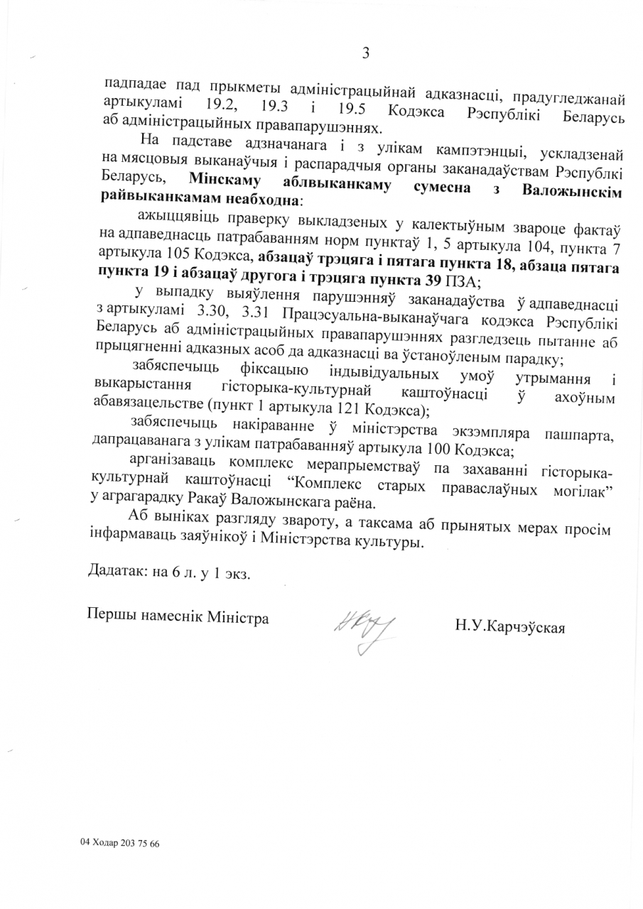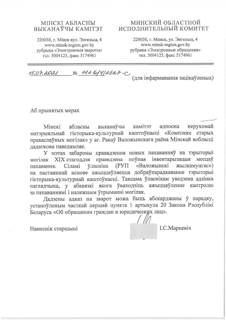 Мінскаму аблвыканкаму сумесна з Валожынскім райвыканкамам даручана ажыццявіць праверку выкладзеных у звароце фактаў, у выпадку выяўлення парушэнняў закадаўства ў адпаведнасці з артыкуламі Працэсуальна-выканаўчага кодэкса аб адміністрацыйных правапарушэннях разгледзець пытанне аб прыцягненні адказных асоб да адказнасці ва ўстаноўленным парадку, а таксама арганізавацаь комплекс мерапрыемстваў па захаванні гісторыка-культурнай каштоўнасці.
