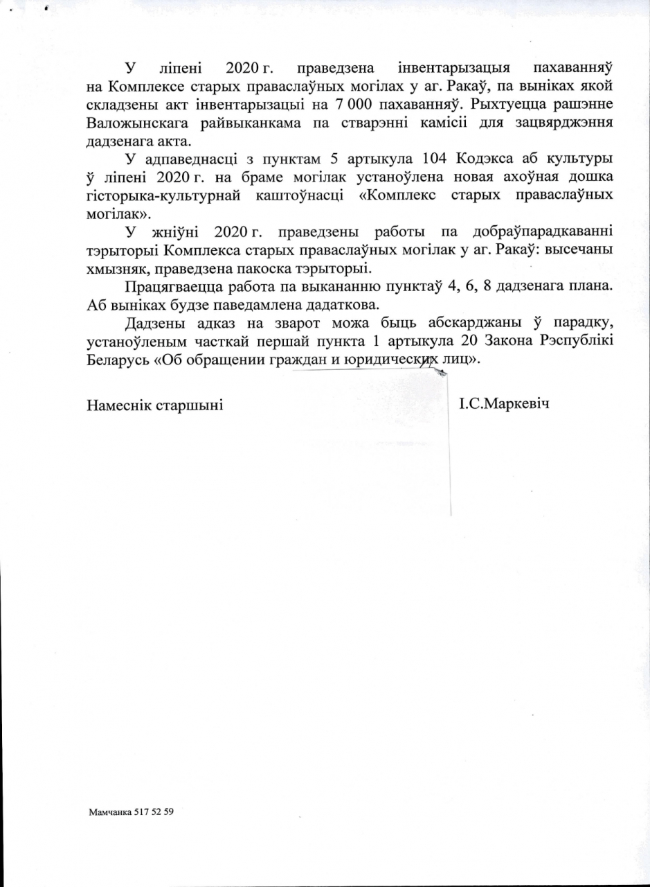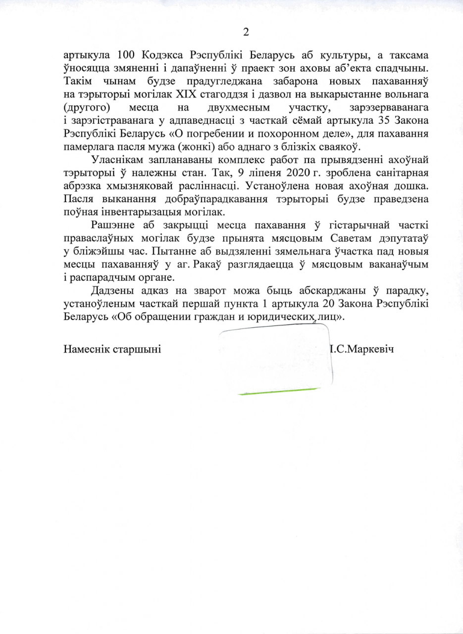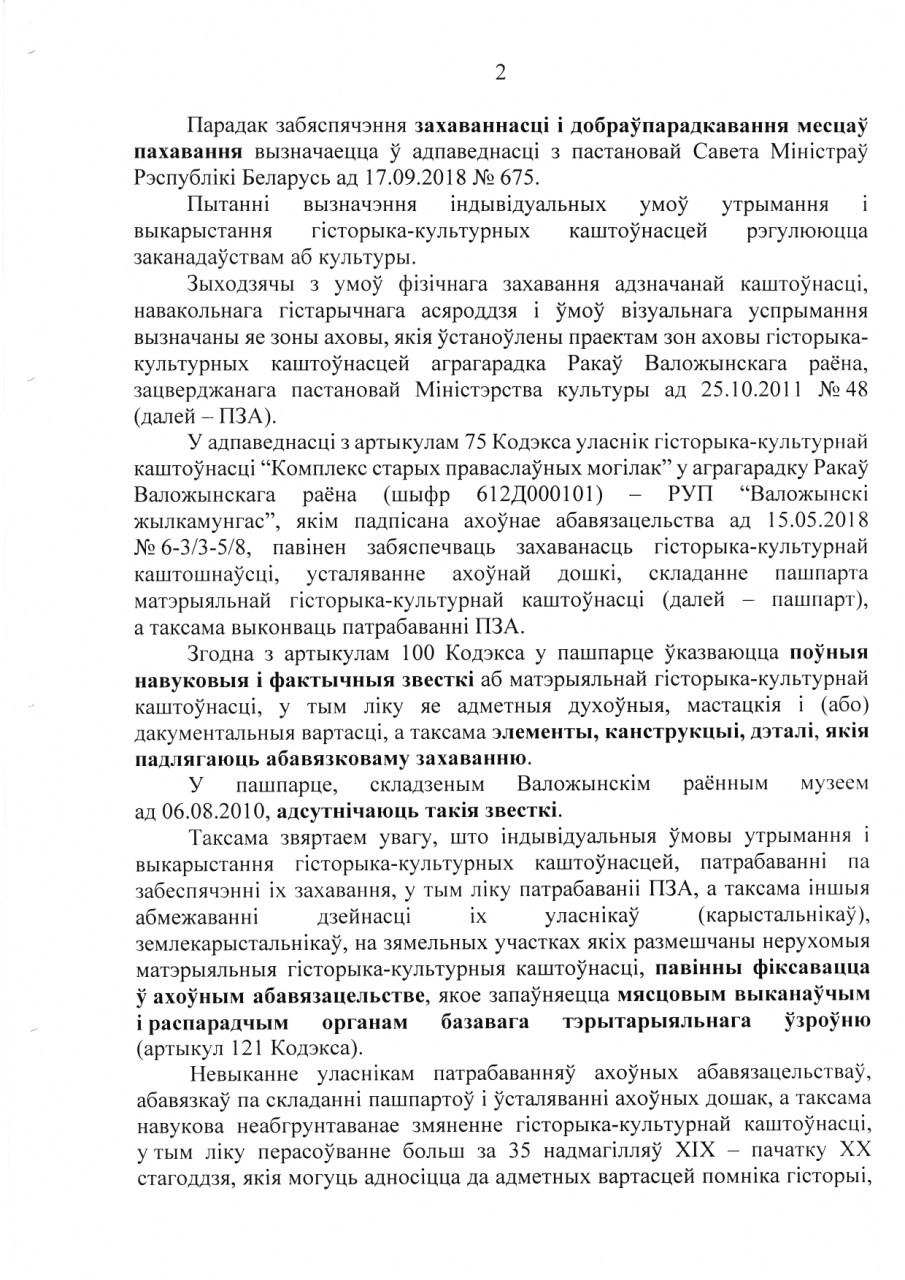 Тамсама ў Дадатку 2 прыводзіцца той аргумент, што ў адпаведнасці з прынятым праектам зон аховы №48 на тэрыторыі ахоўных зон забаронена правядзенне земляных работ без кваліфікаванага археалагічнага нагляду або папярэдніх раскопак, але не прадугледжваецца забарона пахаванняў або закрыццё могілак і дадаецца пералік згодна з Палажэннем аб ахове археалагічных аб’ектаў пры правядзенні земляных і будаўнічых работ,ажыццяўленні іншай дзейнасці на тэрыторыі археалагічных аб’екта, зацверджаным пастановай Савета Міністраў Рэспублікі Беларусь ад 20.07.2012 г. №665. Пры гэтым цалкам ігнаруецца той факт, што новыя пахаванні непасрэдным чынам змяняюць матэрыяльную гісторыка-культурную каштоўнасць, што дапускаецца толькі пасля атрымання дазволу пры ўмове навуковага абгрунтавання гэтага змянення згодна з артыкулам 109 Кодэкса аб культуры Рэспублікі Беларусь. У гэтым жа адказе было заяўлена пра тое, што вырабляюцца і будуць устаноўлены па перыметру могілак інфармацыйныя дошкі аб забароне самавольнага пахавання памерлых на дадзенай тэрыторыі, плануецца ўвядзенне пасады ўпраўляючага могілкамі. Акрамя таго, было даведзена да ведама, што генеральным планам аг. Ракаў былі прадугледжаны дзве пляцоўкі пад размяшчэнне могілак у паўднёвай частцы вёскі. На сёняшні дзень большая частка заяўленых мераў, па нашых дадзеных, не была выканана.