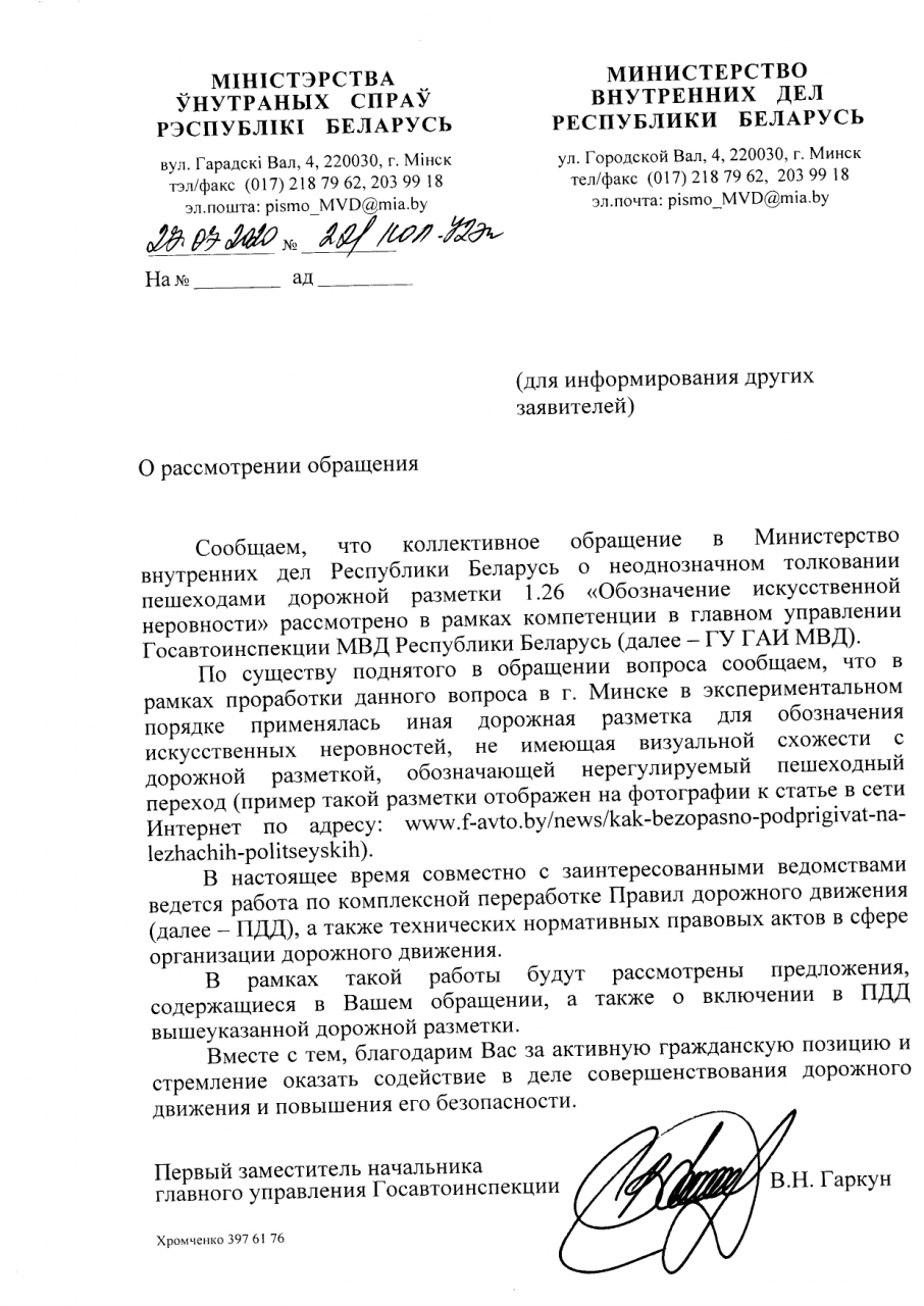 Руководствуясь Положением о Государственной автомобильной инспекции Министерства внутренних дел Республики Беларусь устанавливающим, что одной из функций ГАИ является разработка предложений по повышению безопасности дорожного движения, предупреждению правонарушений в сфере дорожного движения, просим Госавтоинспекцию оценить рациональность расположения искусственных неровностей до и после пешеходного перехода, привести в единый формат окраску пешеходных переходов для чёткого понимания их использования. Как наиболее дешёвый и действенный метод вижу в дополнительной надписи на искусственной неровности "Перехода нет!"