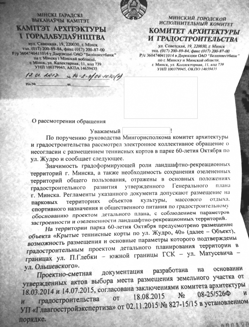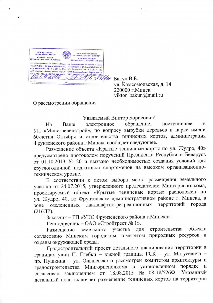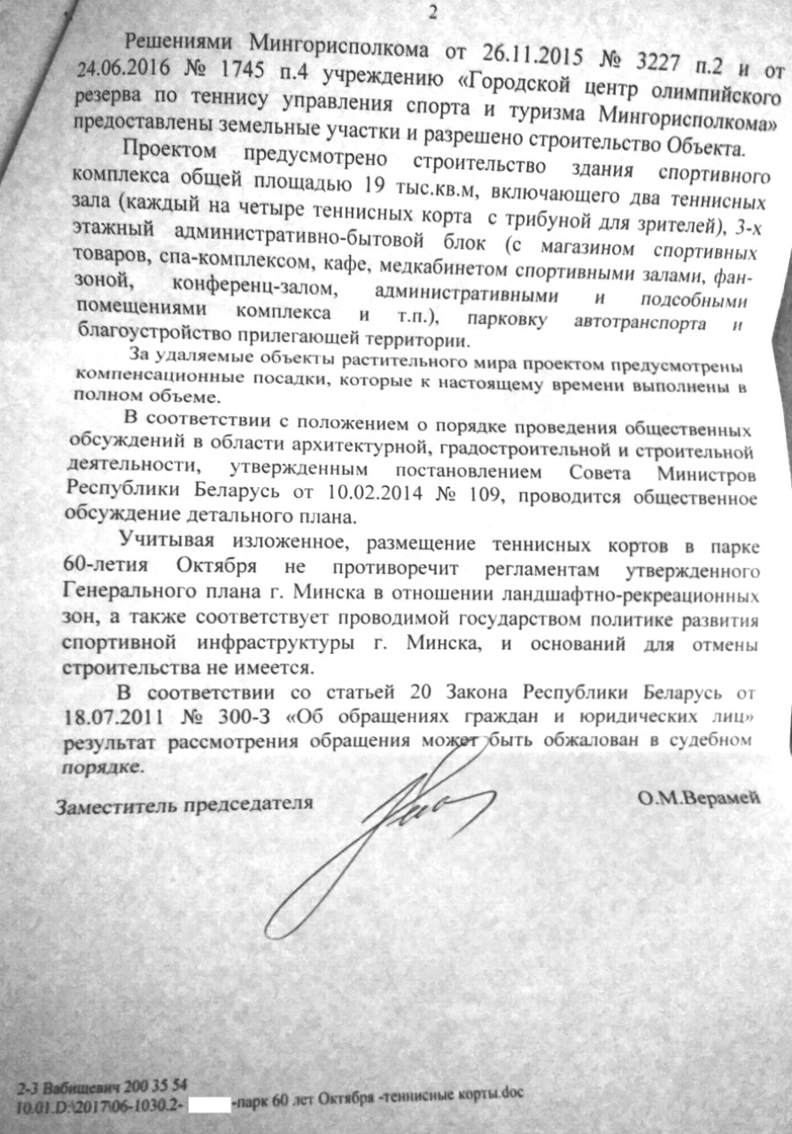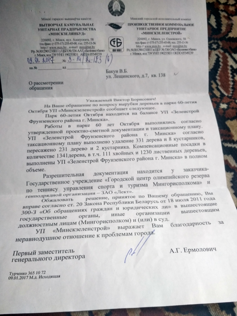 Мы, жители города Минска и (в частности) жители микрорайонов Кунцевщина, Домбровка, а также другие неравнодушные граждане требуем немедленно прекратить вырубку Парка 60-летия октября и прекратить строительство теннисных кортов.
