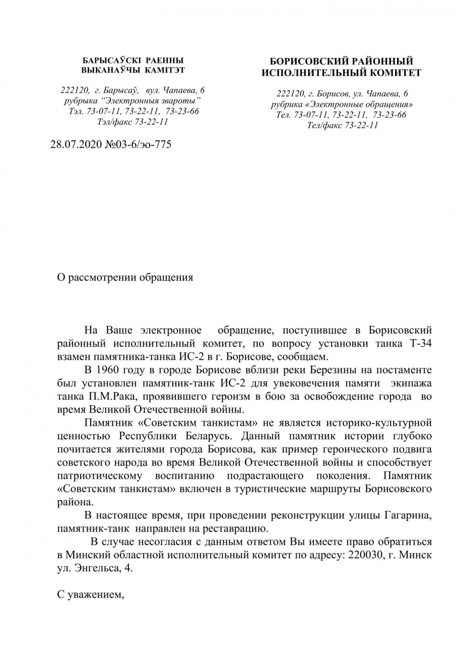 Руководствуясь ст. 41 Закона "О местном управлении и самоуправлении в Республике Беларусь", которая устанавливает, что исполкомы в пределах своей компетенции в порядке, установленном законодательством, формируют и вносят для утверждения в местные Советы депутатов региональные комплексы мероприятий, обеспечивающие реализацию государственных программ, предусматривающих финансирование за счет средств местных бюджетов (исполкомы областного и базового уровней), проекты концепций по вопросам охраны историко-культурного наследия, а также проводят мероприятия по охране историко-культурного наследия, предлагаем во время возведения нового памятника установить на постомент танк Т-34, на котором героически сражался данный экипаж, а не танк ИС-2, который к истории не имеет никакого отношения.