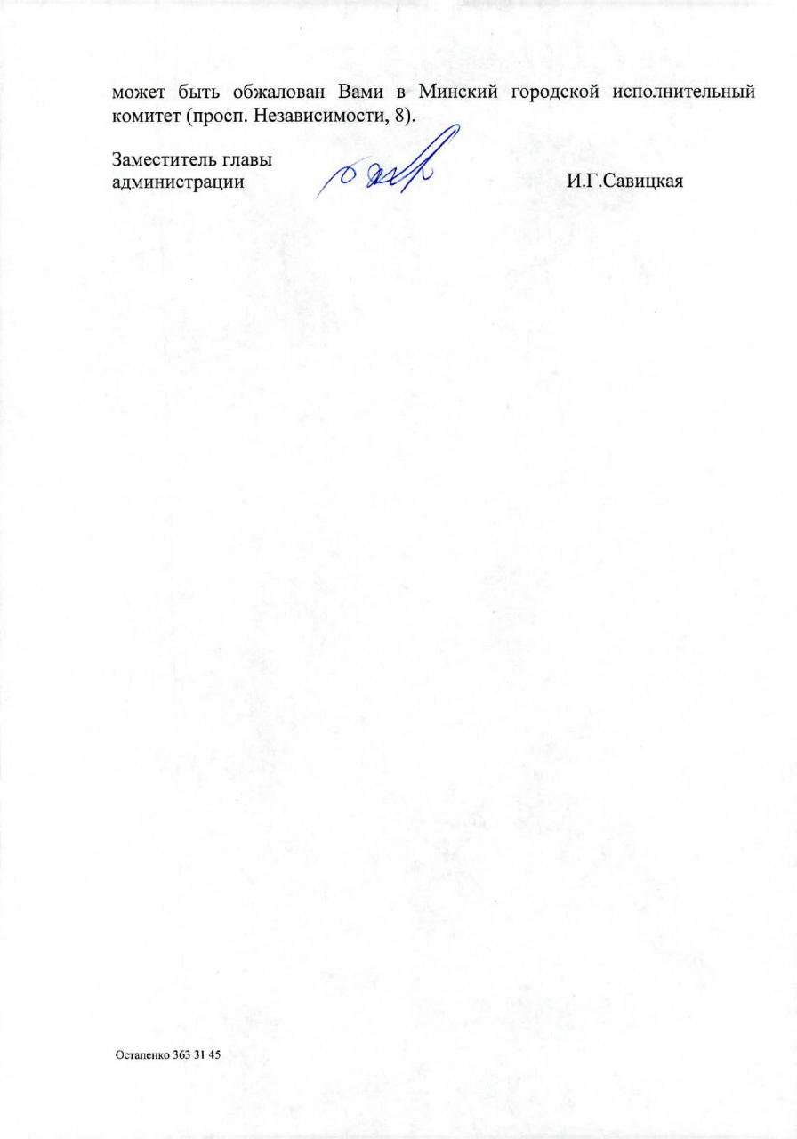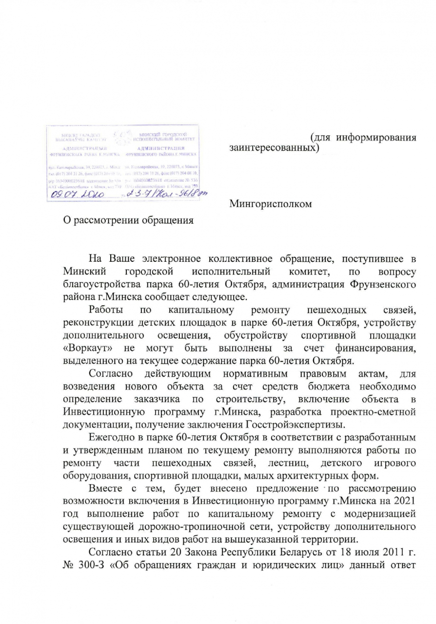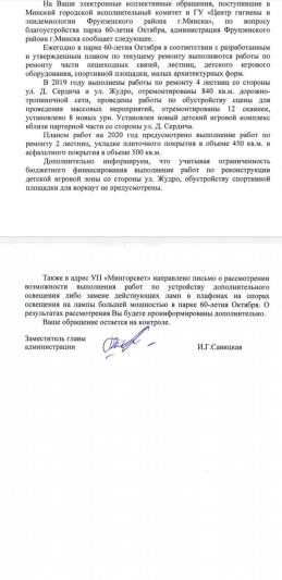 15 июня 2020 г. получен ответ администрации Фрунзенского района г.Минска на электронное обращение о благоустройстве парка 60-летия Октября (копия прилагается). Указанный ответ считаем не соответствующим требованиям законодательства в части полного, всестороннего и объективного рассмотрения обращений и направления мотивированных и обоснованных ответов гражданам по следующим причинам: