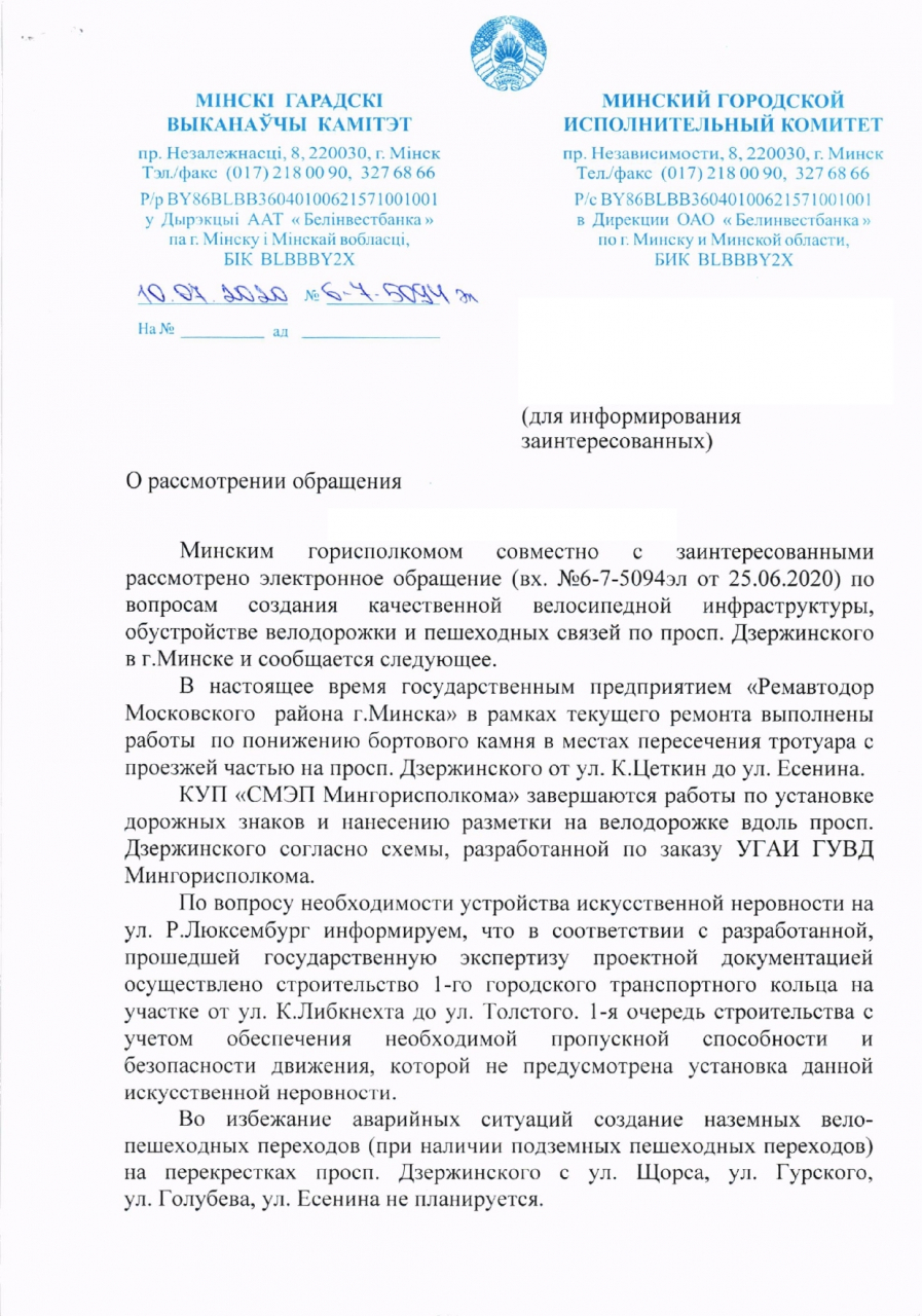 Выполнены работы по понижению бортового камня в местах пересечения тротуара с проезжей частью на пр-те Дзержинского от ул.К.Цеткин до ул.Есенина. Завершаются работы по установке дорожных знаков и нанесению разметки на велодорожке вдоль проспекта. Установка искусственной неровности на ул.Р.Люксембург не предусмотрена. Создание наземных вело-пешеходных переходов на перекрёстках пр-та Дзержинского с ул.Щорса, ул.Гурского, ул.Голубева и ул.Есенина не планируется.