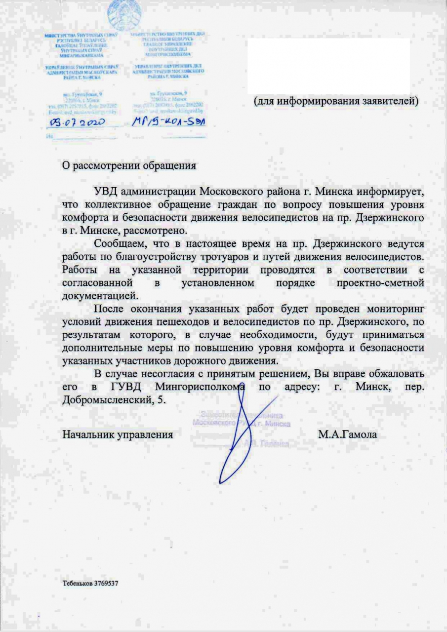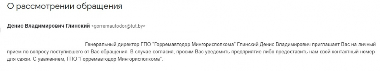 Генеральный директор ГПО "Горремавтодор Мингорисполкома" приглашает заявителей на личный приём по вопросу поступившего обращения. В случае согласия, необходимо уведомить предприятие либо предоставить его представителям свой контактный номер для связи.