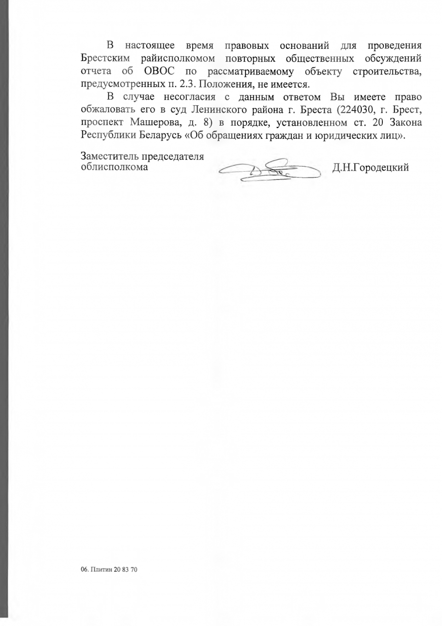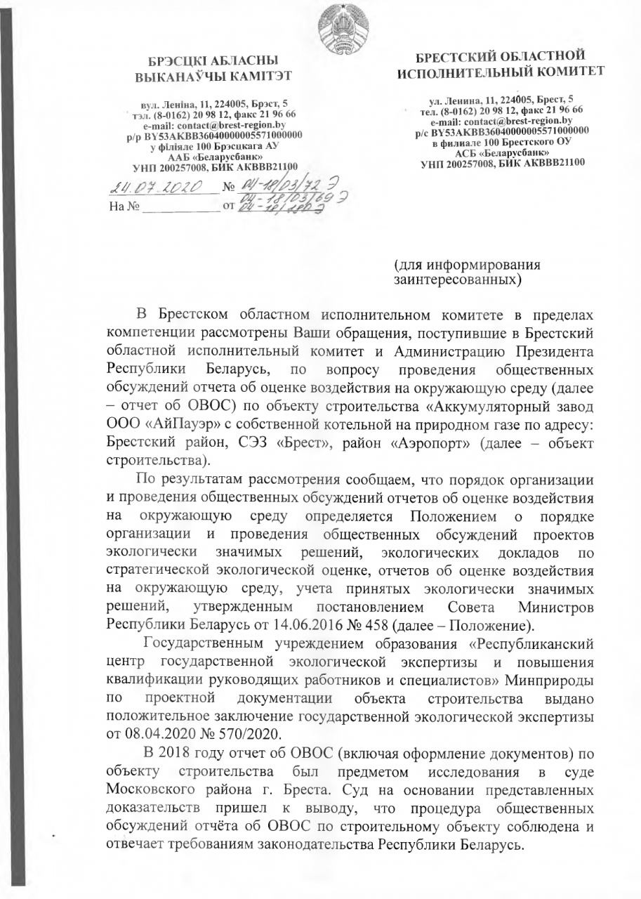 В настоящее время правовых оснований для проведения Брестским райисполкомом повторных общественных обсуждений отчёта об ОВОС по объекту строительства "Аккумуляторный завод ОАО "АйПауэр" с собственной котельной на природном газе" не имеется.