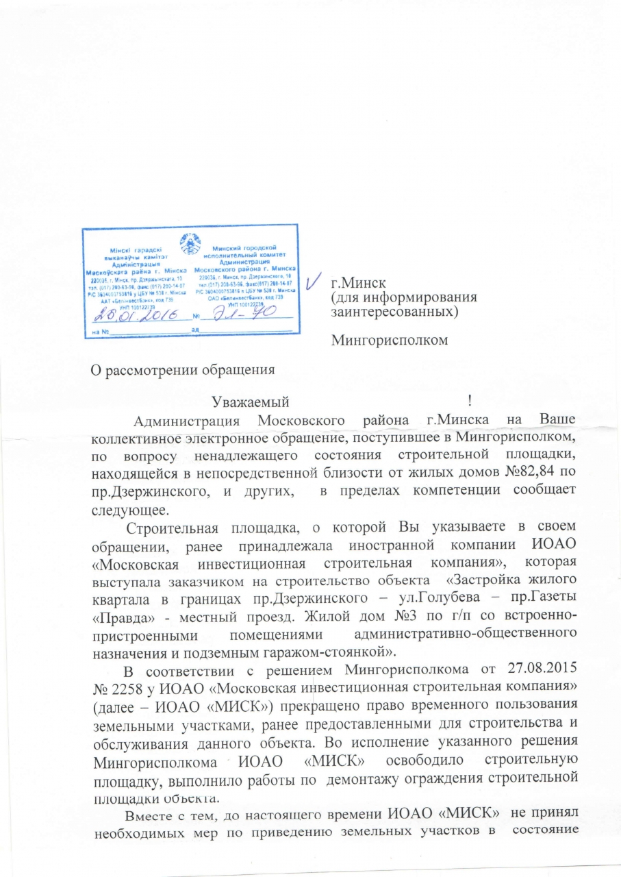 После завершения строительства нового жилого квартала в Московском районе (пр. Дзержинского д.д. 82, 84 и др.), до сих пор остается неиспользуемая площадка, закрытая заборами. Насколько известно на данный момент, дальнейшей стройки объектов там не планируется. Таким образом, необходимо срочно (!) навести на этой территории порядок по нескольким причинам. Во-первых, это вопрос безопасности для детей этого квартала; во-вторых, эстетический вид нашего района; в-третьих, для жильцов близлежащих домов перекрыт проход ко входам станции метро Петровщина.