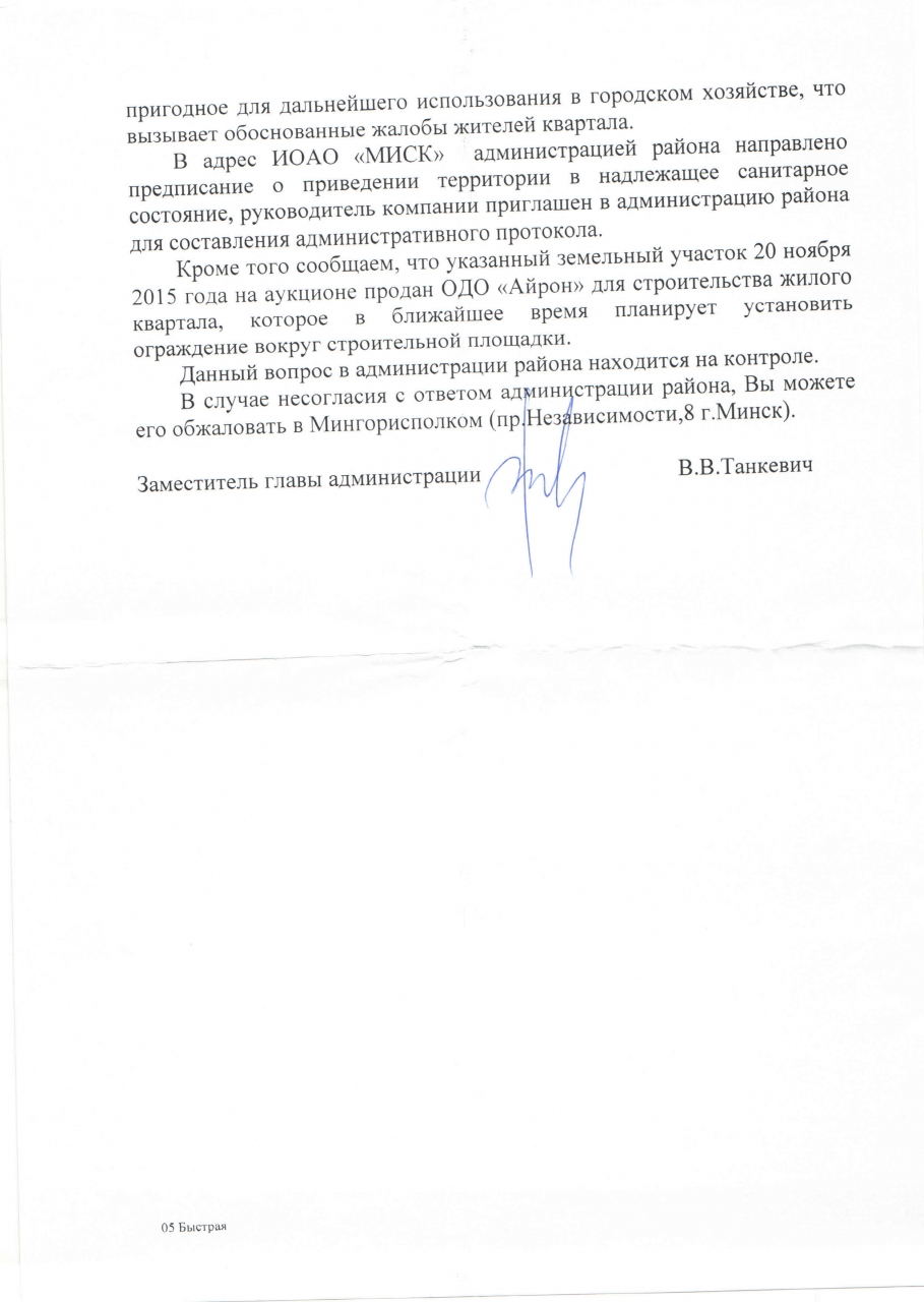 Жалоба признана обоснованной, юридическому лицу, которое пользовалось земельным участком (ИОАО "Московская инвестиционная строительная компания"), направлено предписание о приведении территории в надлежащее санитарное состояние, в отношении руководителя будет составлен административный протокол.