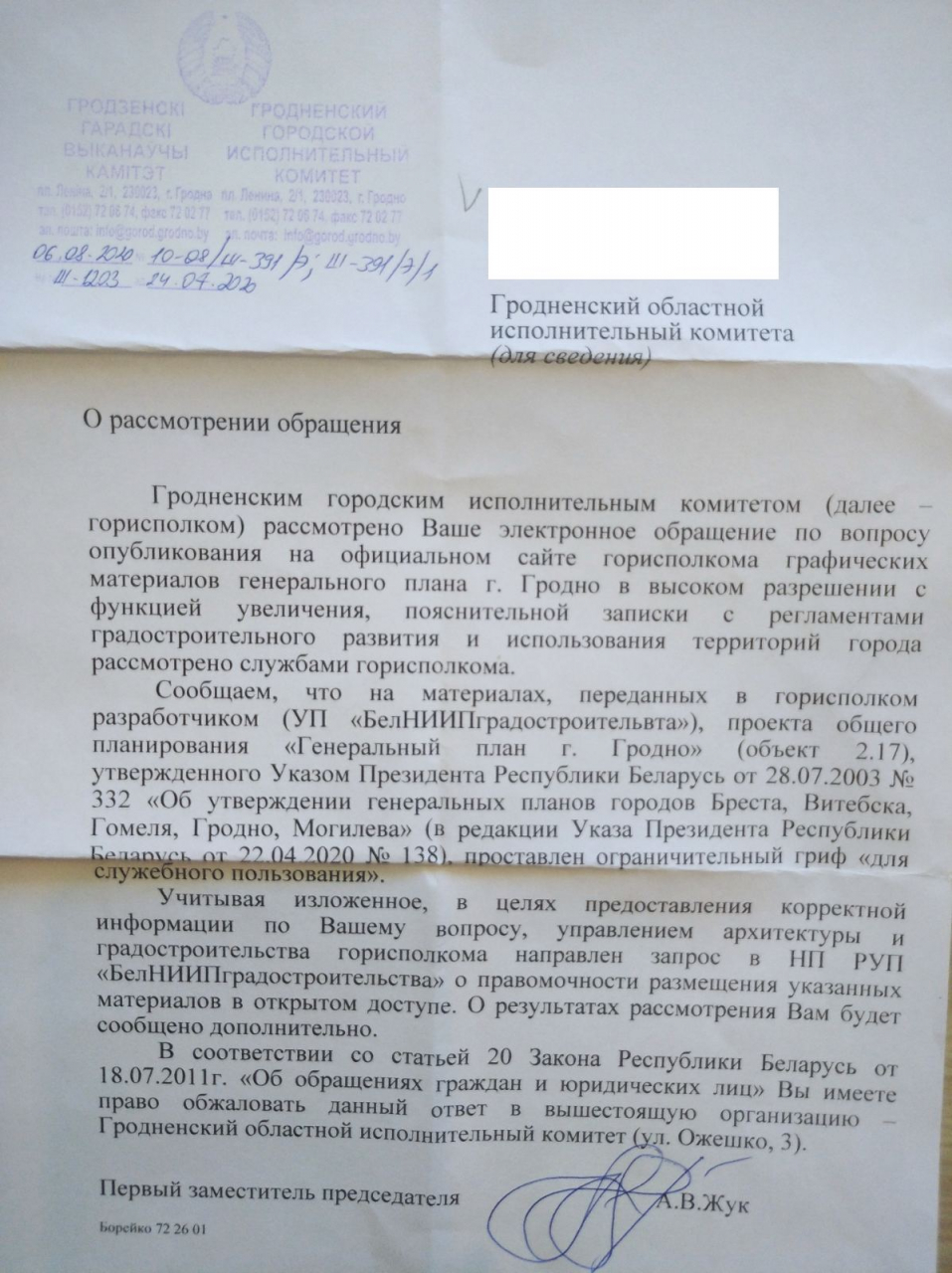 Указом Президента Республики Беларусь от 22 апреля 2020 г. № 138 утверждена новая редакция генерального плана г.Гродно. Общественное обсуждение генплана широко освещалось в СМИ, однако результаты нам, гродненцам иным заинтересованным гражданам, визуально представлены не были ни прессой, ни на сайте Гродненского городского исполнительного комитета.