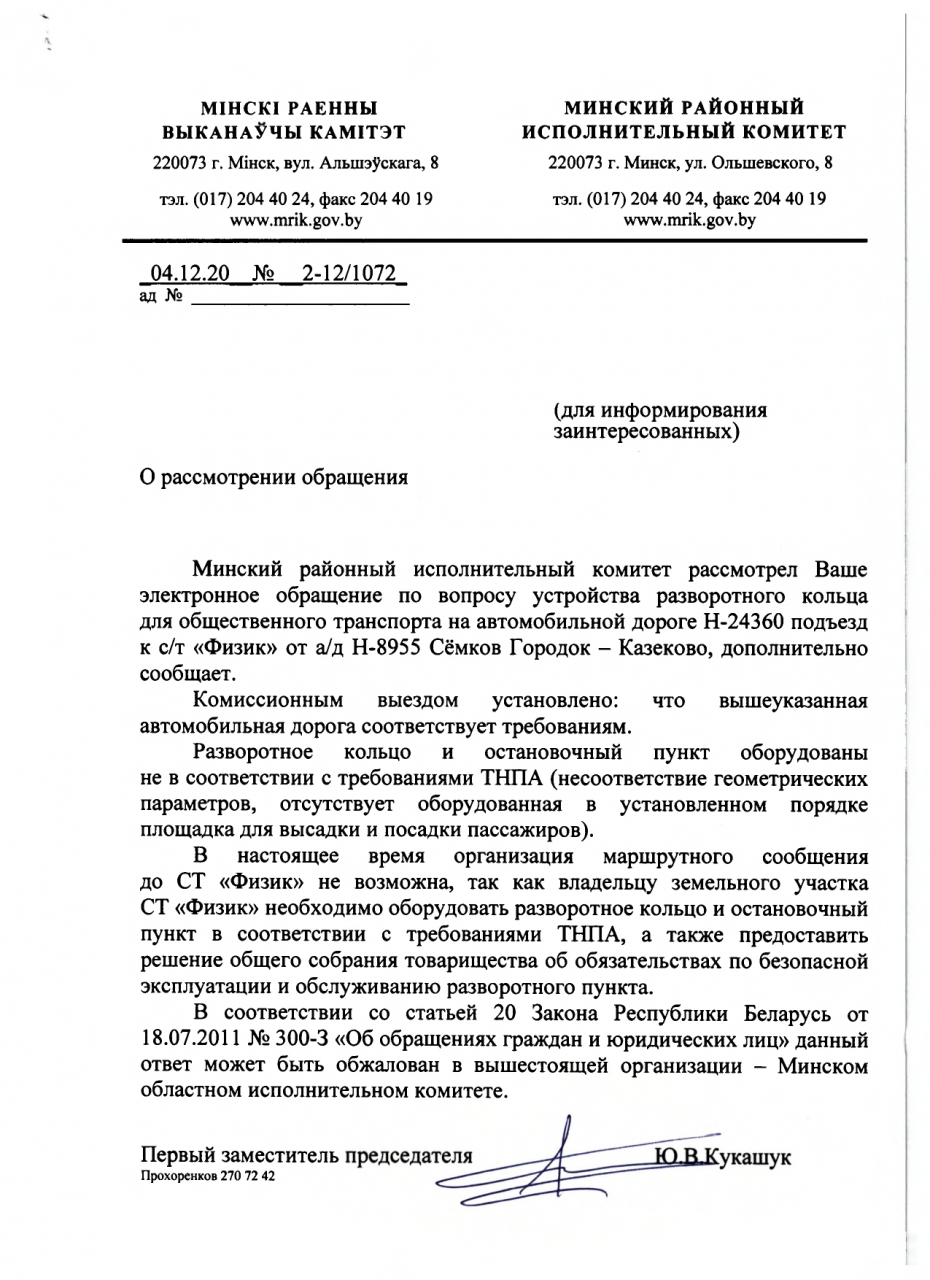 UPD. Автодорога Н-24360 соответствует требованиям, разворотное кольцо и остановочный пункт оборудованы не в соответствии с требованиями ТНПА. Организация маршрутного сообщения до СТ "Физик" в настоящее время невозможна.