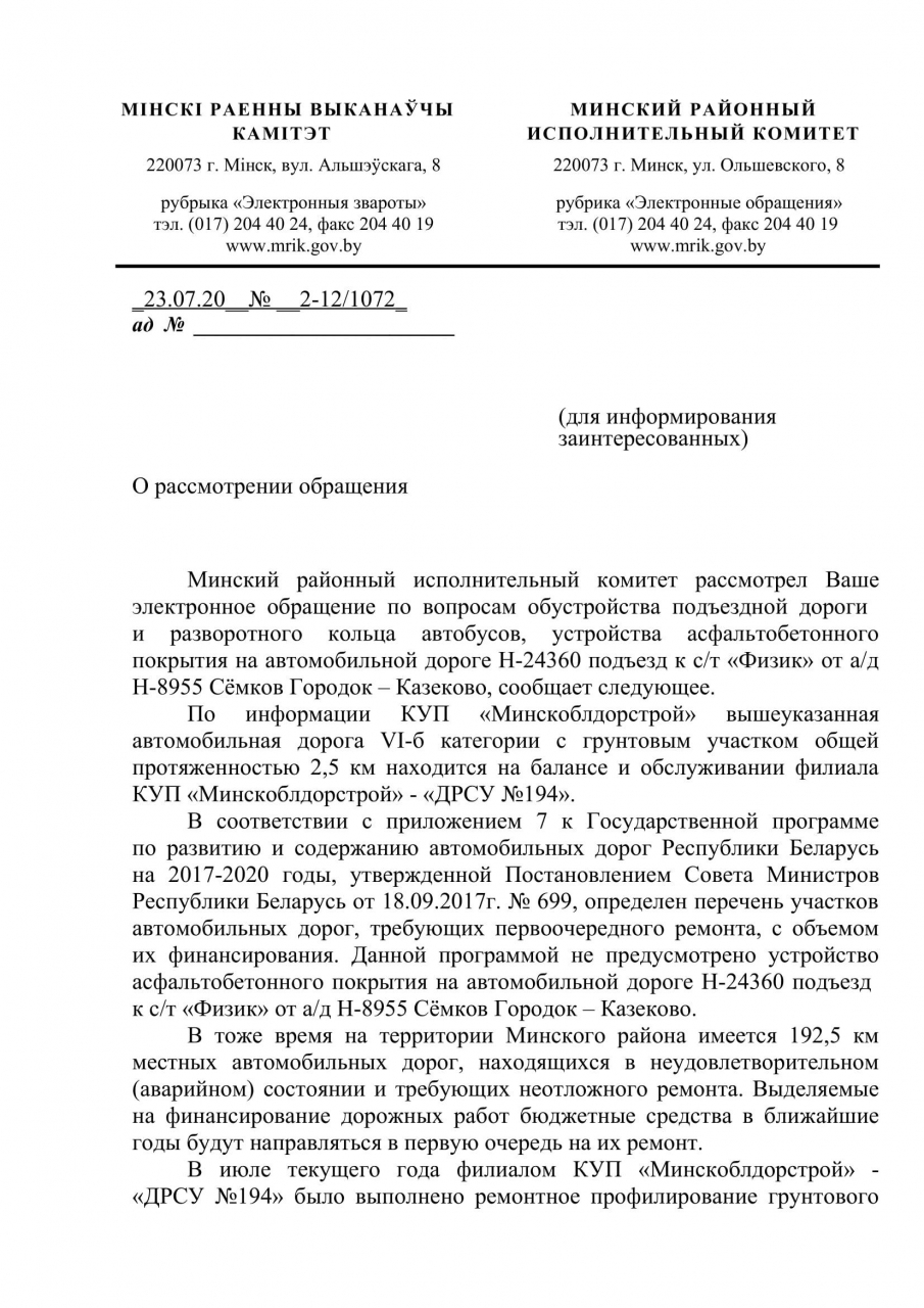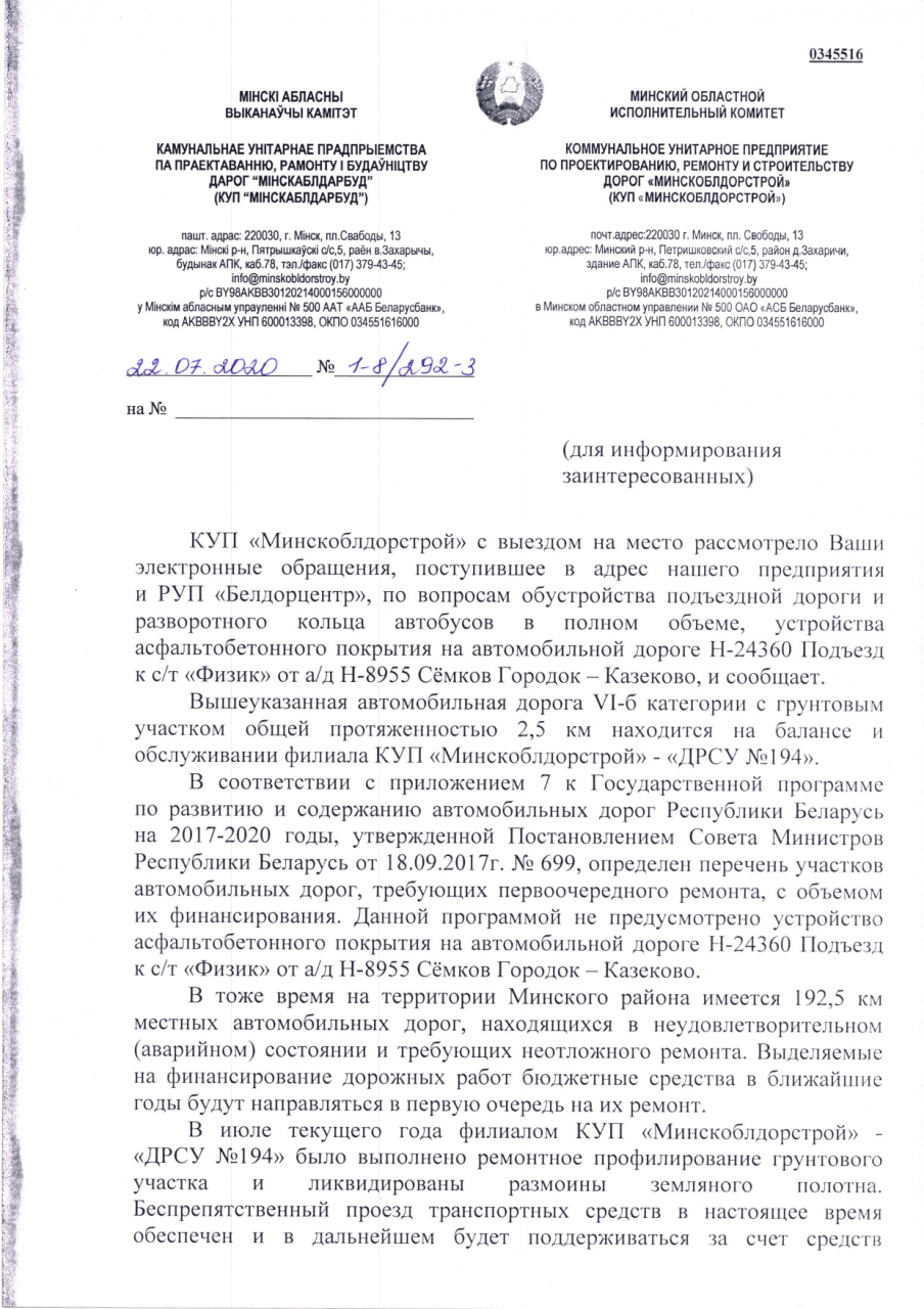 В 2011-2012 гг.. КУП Минскоблдорстрой выполняло ряд работ для организации продления автобусного маршрута к посёлку СТ «Физик-Чернявка» на участке дороги, находящейся на балансе ДРСУ № 194 , от автодороги Н 8955 «Семков городок-Казекова» к поселку СТ «Физик», «Чернявка». При этом, работы по устройству асфальтобетонного покрытия на подъездной дороге выполнены не были на протяжённости 1.5 км. Так как весной, летом и осенью в посёлке проживает, по нашим подсчётам, более тысячи человек и движение по указанной дороге достаточно интенсивное, то, периодически, гравийное дорожное покрытие из-за погодных условий приходит в ненадлежащее состояние, а именно, принимает вид «стиральной доски» и становится опасным для движения техники (рейсовый автобус. разминаясь со встречным автомобилем, по нашим данным, неоднократно съезжал в кювет). Грейдирование этого участка осуществляется несвоевременно по разным причинам: отсутствие топлива, поломкой грейдера и иным причинам. Водители рейсовых автобусов, которые подвозят жителей поселка, требуют от правлений наших садоводческих товариществ решить вопрос в органах дорожного строительства об устройстве асфальтобетонного покрытия.