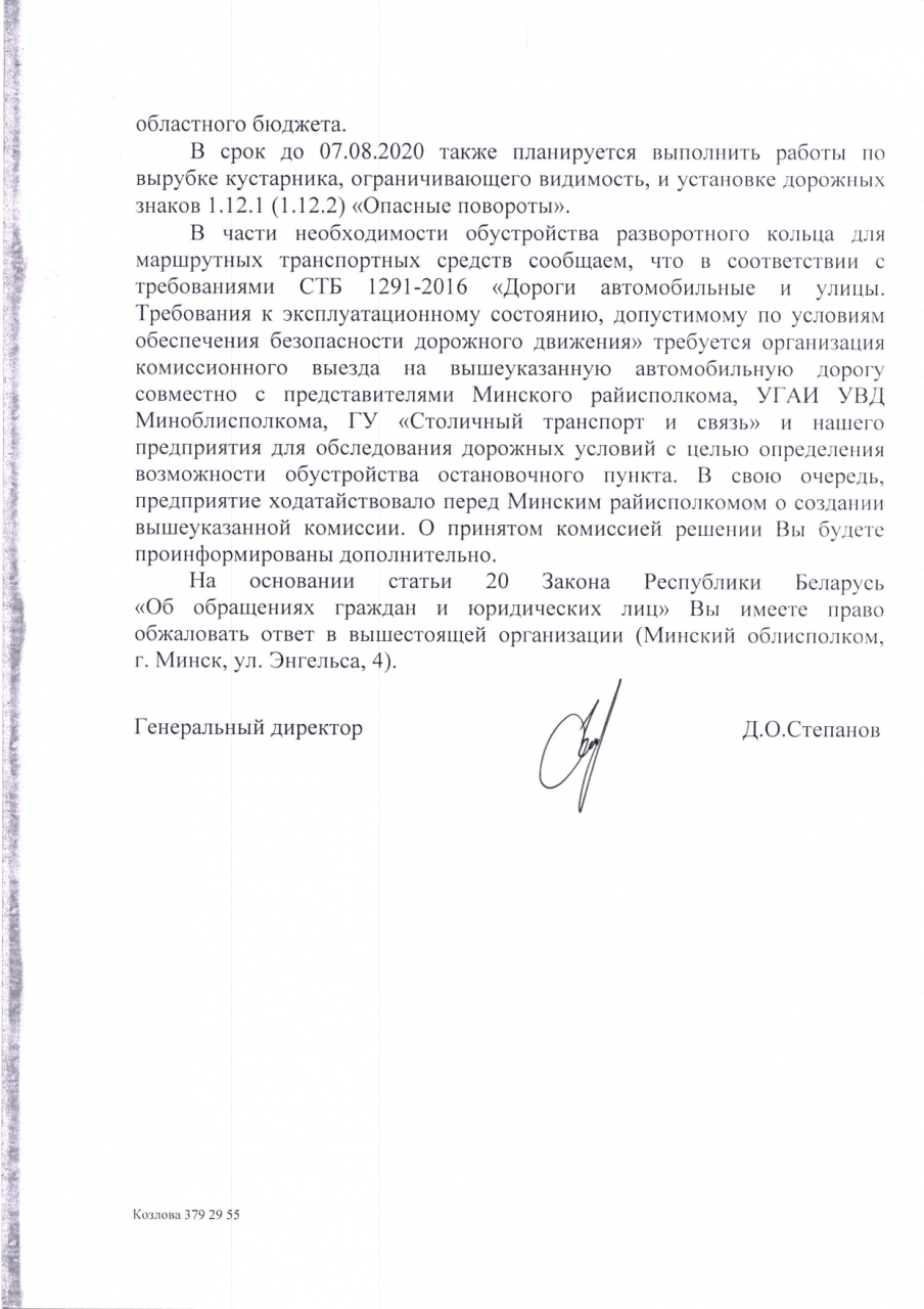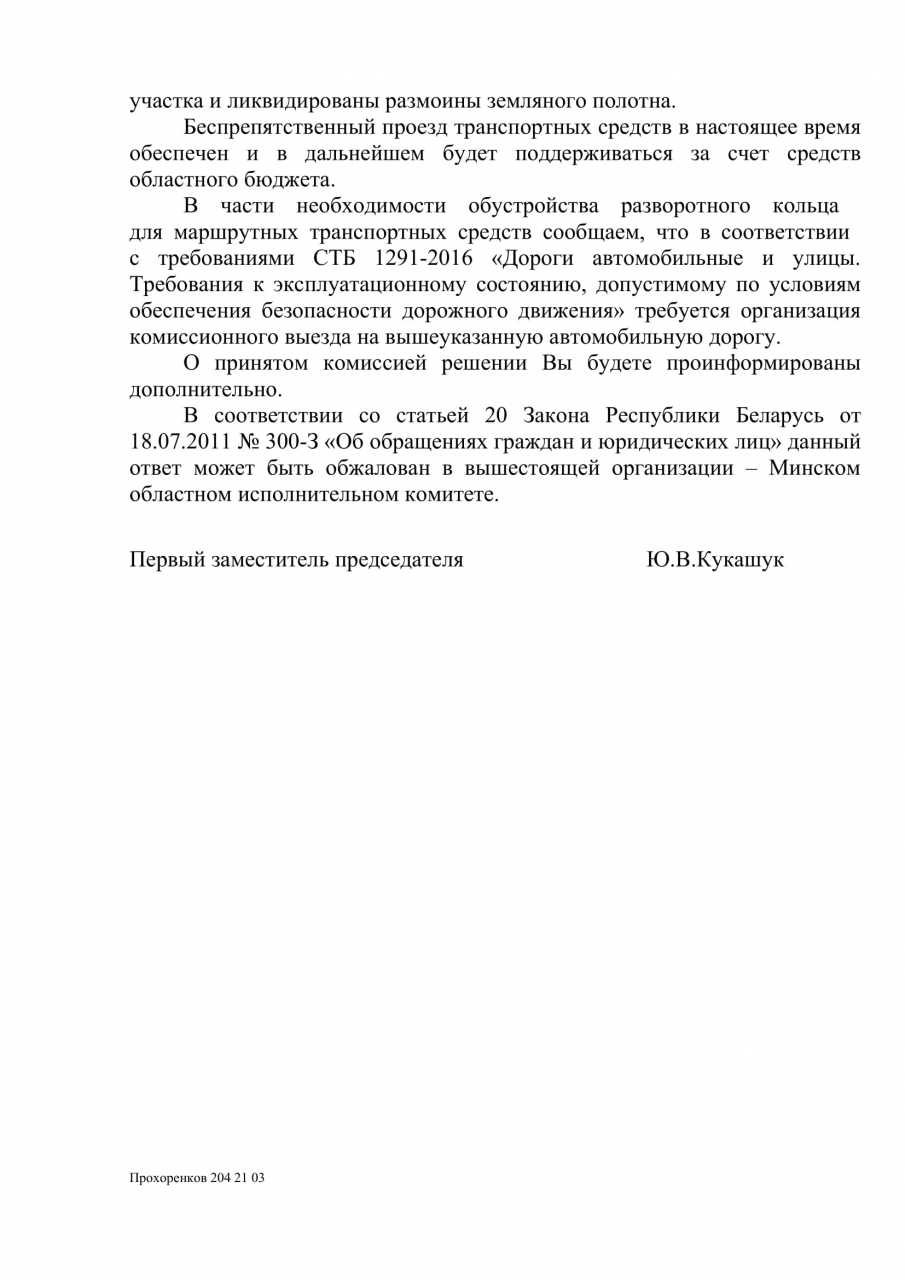 Во исполнение Указа Президента Республики Беларусь от 28 ноября 2005 г. № 551 «О мерах по повышению безопасности дорожного движения», а также руководствуясь ст.41 Закона "О местном управлении и самоуправлении в Республике Беларусь", которая устанавливает, что исполкомы в пределах своей компетенции в порядке, установленном законодательством, организуют строительство, реконструкцию, ремонт и содержание местных автомобильных дорог, и Положением о РУП "Белдорцентр", определяющим, что его основными задачами являются, в том числе освидетельствование и приёмка качественно выполненных объемов работ по содержанию, ремонту и строительству автомобильных дорог общего пользования, повышение оперативности и качества оказания услуг, обращаемся к Вам с просьбой о выполнении запланированных ранее работ по обустройству подъездной дороги и разворотного кольца автобусов в полном объёме и устройству асфальтобетонного покрытия.