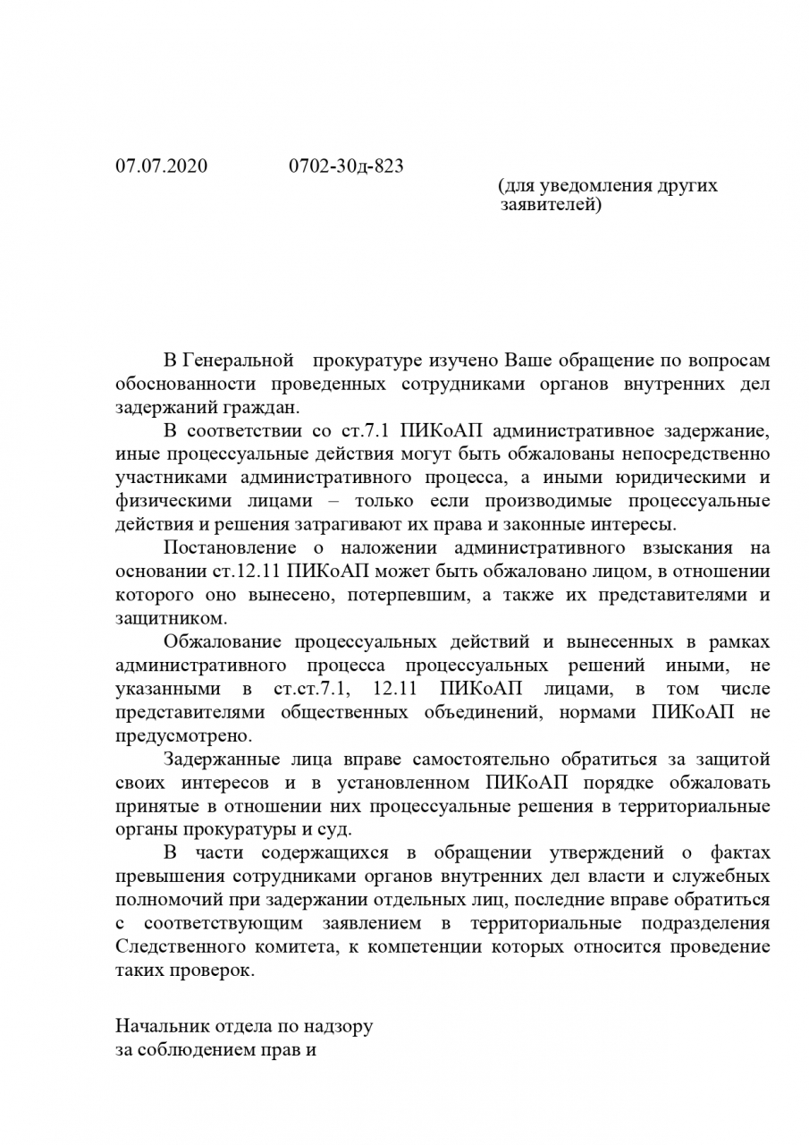 Задержанные лица вправе самостоятельно обратиться за защитой своих интересов и в установленном ПИКоАП порядке обжаловать принятые в отношении них процессуальные решения в территориальные органы прокуратуры и суд. В части содержащихся в обращении утверждений о фактах превышения сотрудниками органов внутренних дел власти и служебных полномочий при задержании отдельных лиц, последние вправе обратиться с соответствующим заявлением в территориальные подразделения Следственного комитета, к компетенции которых относится проведение таких проверок.