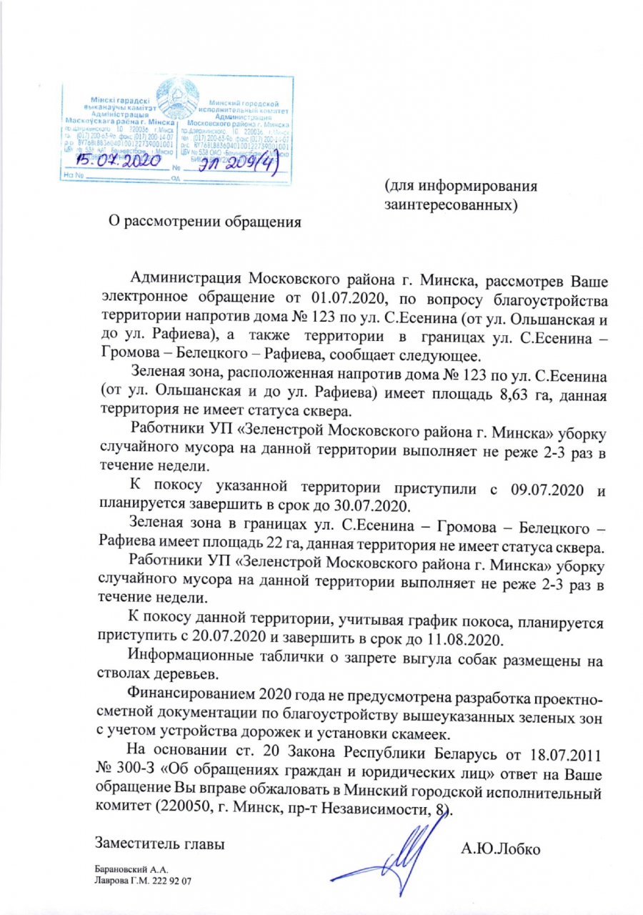Руководствуясь ст.45 Закона "О местном управлении и самоуправлении в Республике Беларусь", устанавливающей, что местные администрации в пределах своей компетенции в порядке, установленном законодательством, обеспечивают благоустройство и поддержание надлежащего санитарного состояния на соответствующей территории, просим привести в порядок скверы: