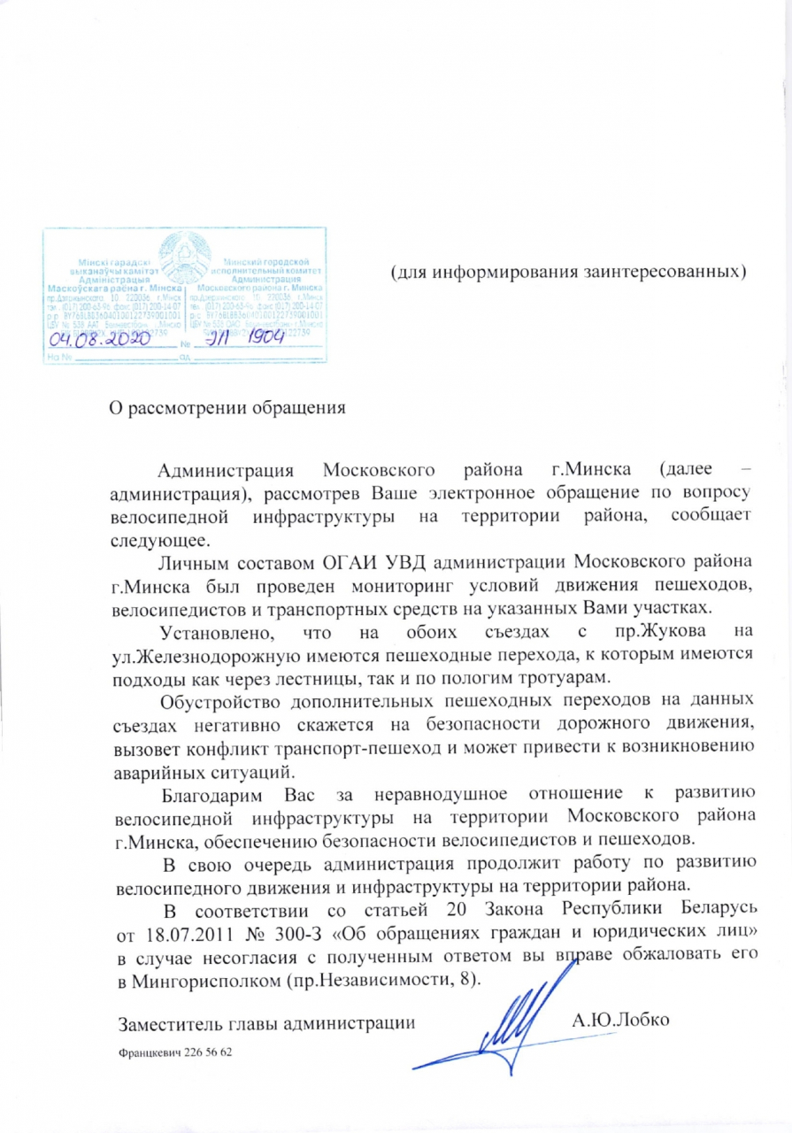 Для обеспечения безопасности и комфортного передвижения велосипедистов и пешеходов, руководствуясь ст.45 Закона "О местном управлении и самоуправлении в Республике Беларусь", которая устанавливает, что местные администрации в пределах своей компетенции в порядке, установленном законодательством, обеспечивают безопасность дорожного движения, требуем: