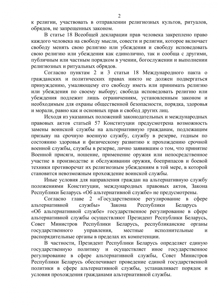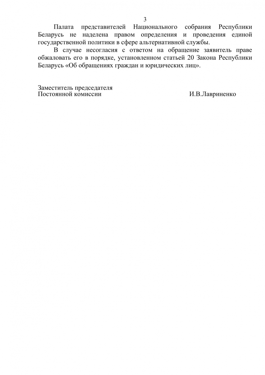 Палата представителей Национального собрания Республики Беларусь не наделена правом определения и проведения единой государственной политики в сфере альтернативной службы.