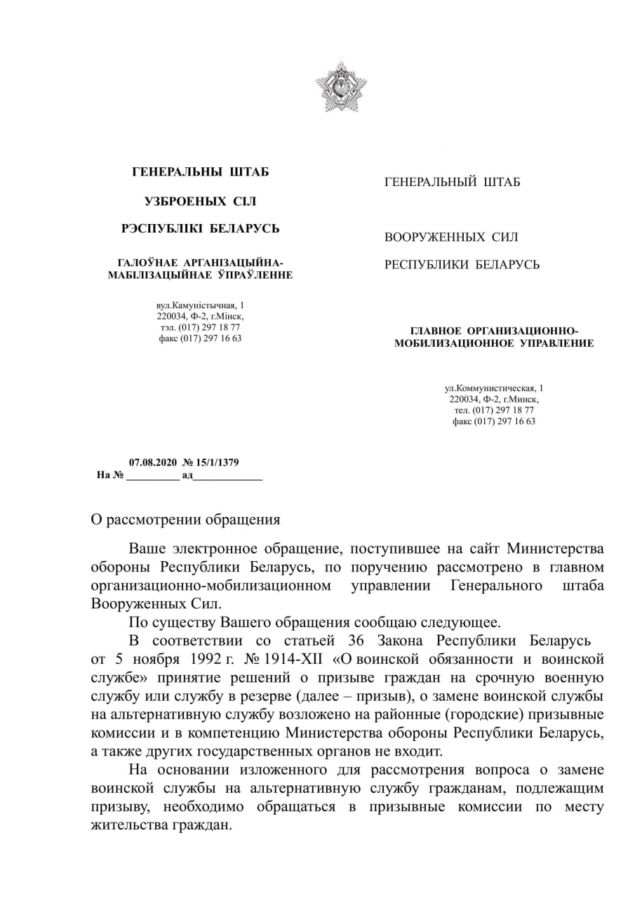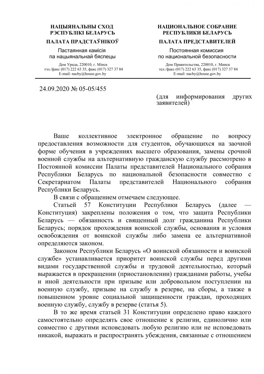 Настоящим обращением требуем предоставить возможность для студентов, обучающихся на заочной форме обучения в учреждениях высшего образования заменять срочную военную службу на альтернативную гражданскую службу.