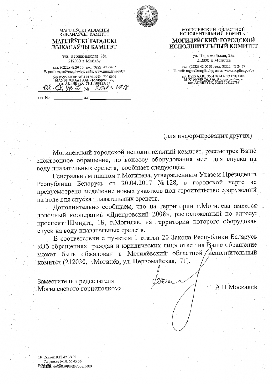 На территории Могилёва имеется лодочный кооператив, на территории которого оборудован спуск на воду плавательных средств.