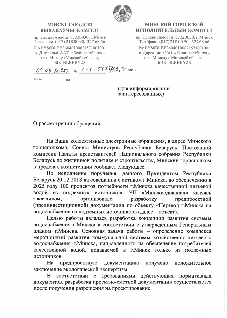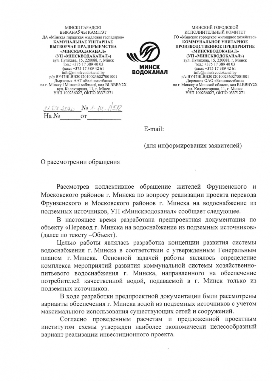 Мы, нижеподписавшиеся жители Фрунзенского и Московского районов г.Минска (районы, которые снабжаются водой из поверхностных источников), а также иные заинтересованные граждане, настоятельно просим реализовать до конца ранее согласованный проект изменения водоснабжения указанных районов (в рамках утверждённых госпрограмм по водоснабжению и водоотведению «Чистая вода» города Минска на 2011-2015 годы и «Комфортное жилье и благоприятная среда» на 2016–2020 годы), а именно перевод г.Минска на артезианское водоснабжение.