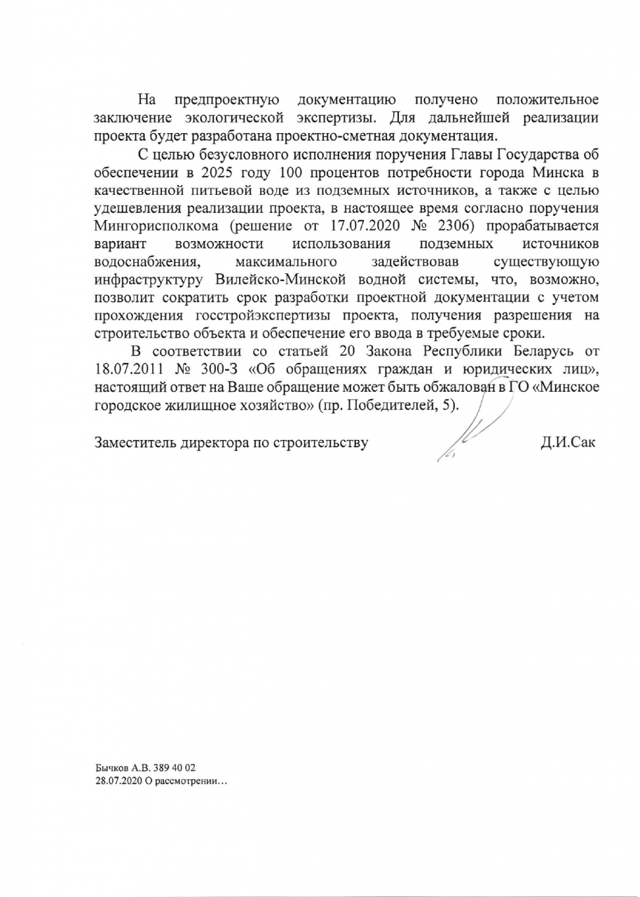 Считаем, что после последнего происшествия с водой, произошедшего 24 июня 2020 г., в результате которого около 800 тыс. человек ощутили существенные проблемы с качеством и нехваткой питьевой воды, а это приблизительно 8% от численности населения всей Республики, этот вопрос имеет первоочередное значение, поэтому требуем 1. включить финансирование проекта о 100 процентном переводе водоснабжения г.Минска на подземные источники при формировании республиканского и местных (г.Минска и Минской обл.) бюджетов ближайших годов.