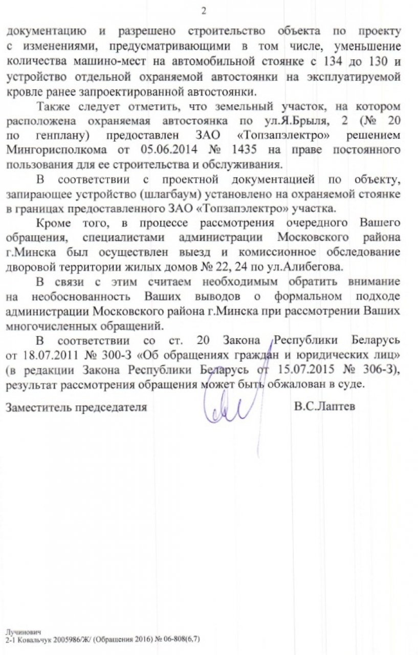 Просим предоставить информацию о решении Мингориспокома, согласно которому эксплуатируемая кровля в районе домов 22 и 24 по ул. Алибегова в г. Минске превратилась в платную парковку ЗАО "Топзапэлектро". Несмотря на нарушение требований СанПиН № 35 (утв. Постановлением Министерства здравоохранения Республики Беларусь от 15.05.2014 № 35) Пункт 20. Выезд-въезд из автомобильных стоянок и автомобильных парковок, расположенных на территории жилой застройки, должны быть организованы на улично-дорожную сеть населенного пункта, исключая организацию движения автотранспорта по внутридворовым проездам, парковым дорогам и велосипедным дорожкам.
