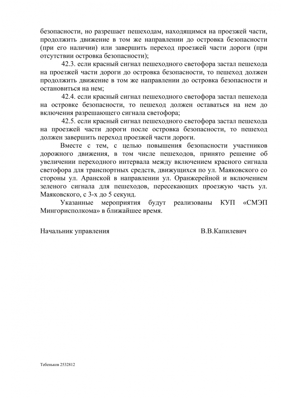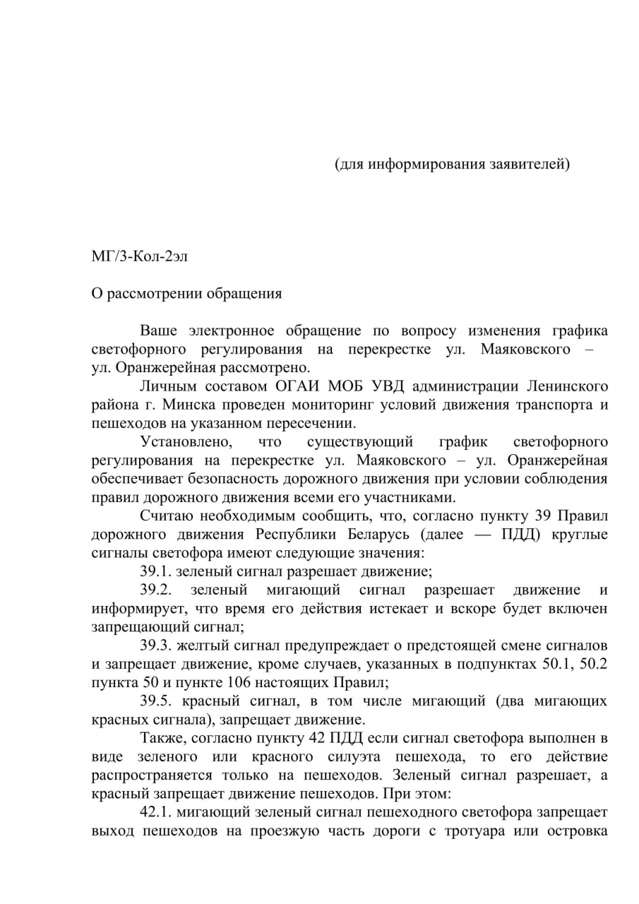 Руководствуясь ст.45 Закона "О местном управлении и самоуправлении в Республике Беларусь" , устанавливающей, что местные администрации в пределах своей компетенции в порядке, установленном законодательством, обеспечивают безопасность дорожного движения, а также пп.17.2 п.17 Положения о Государственной автомобильной инспекции Министерства внутренних дел Республики Беларусь, согласно которому одной из основной функций ГАИ является выявление причин и условий, способствующих совершению дорожно-транспортных происшествий, нарушений Правил дорожного движения, иных противоправных действий в сфере безопасности дорожного движения, принятие в пределах своей компетенции мер по их устранению, требуем изменить время срабатывания запрещающего сигнала светофора для автомобилей, расположенного рядом с пешеходным переходом на ул.Маяковского вблизи ул.Аранской.