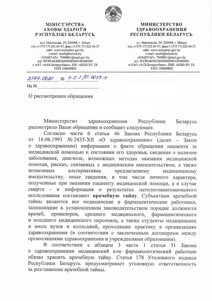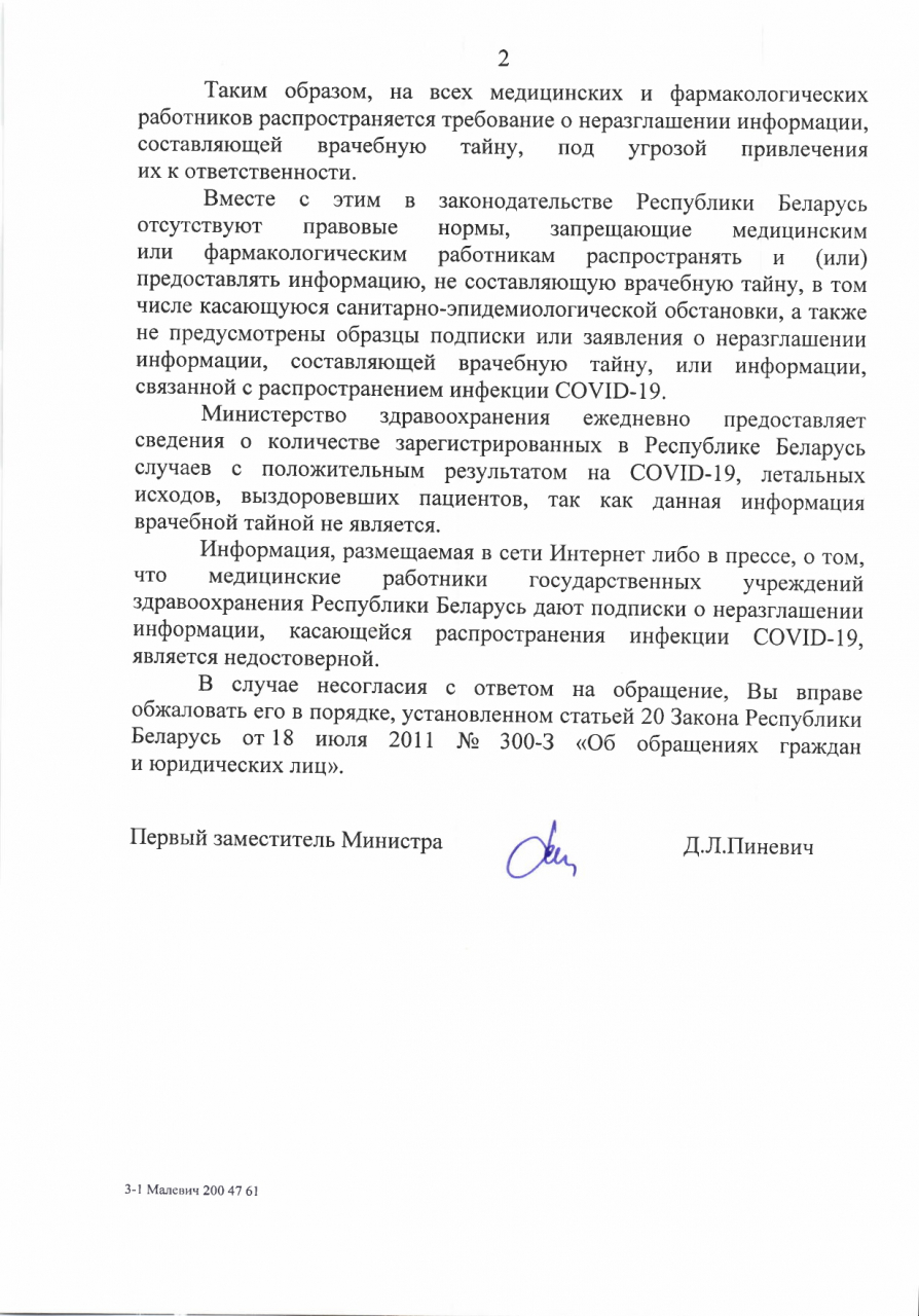 1. Обязывают (обязывали) ли тех или иных медицинских работников Республики Беларусь не разглашать информацию, касающуюся эпидемии коронавируса COVID-19 (в частности, число заболевших в том или ином населённом пункте, число лиц, которым поставлен данный диагноз в определённом медицинском учреждении и тому подобные сведения).