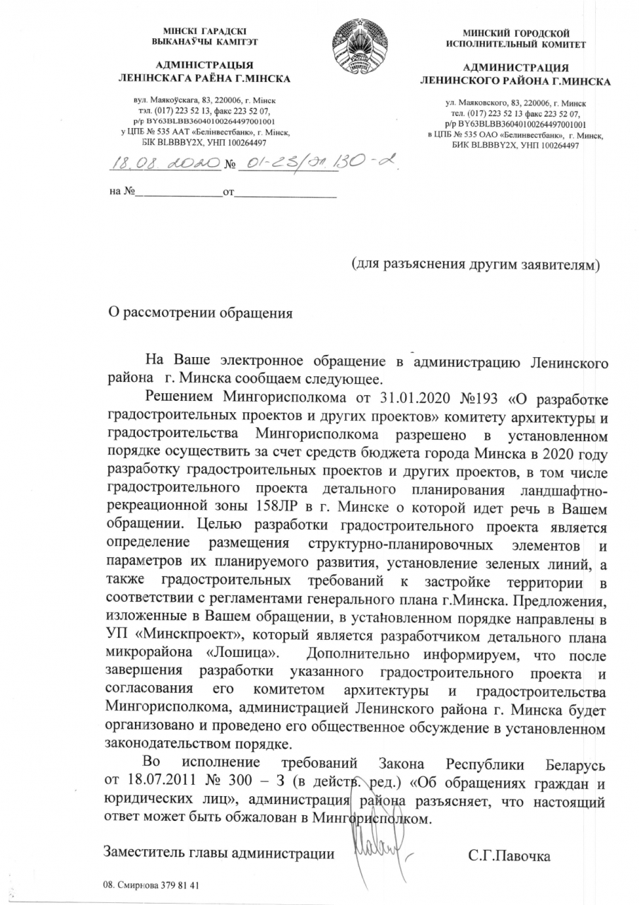 Предложения, изложенные в обращении, направлены в УП "Минскпроект", который является разработчиком детального плана микрорайона "Лошица".
