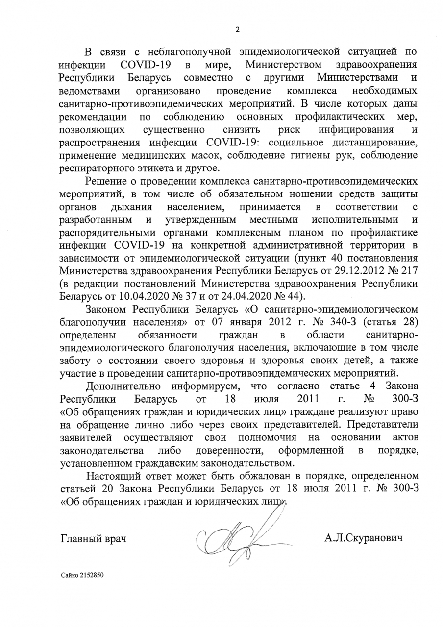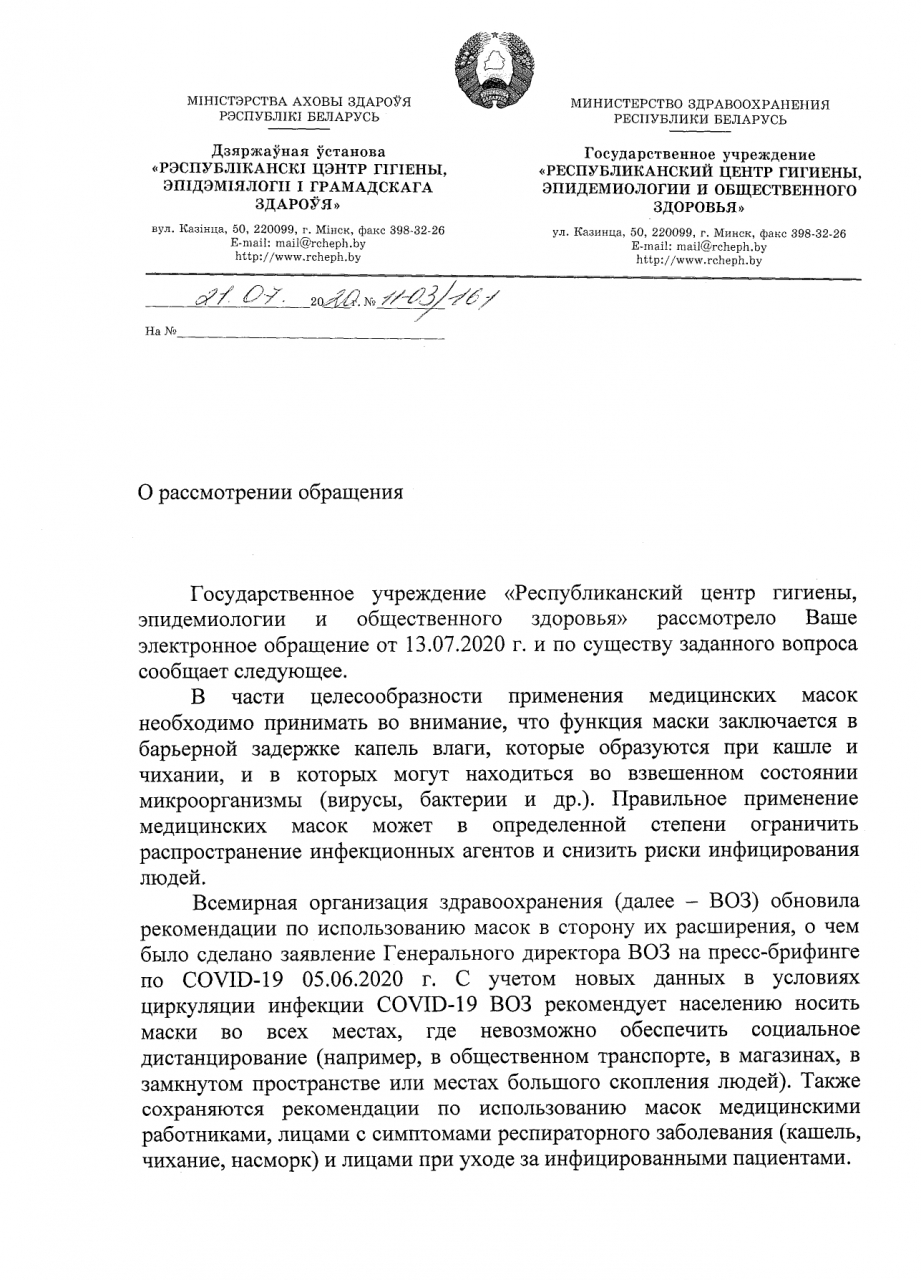 Сейчас в Республике Беларусь, на наш взгляд, есть необходимость не вводить ,,масочный режим,, в любой административной единице.