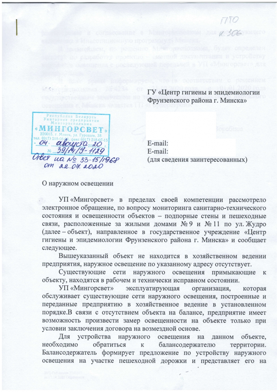 Дополнительно просим ГУ "Центр гигиены и эпидемиологии Фрунзенского района г. Минска" провести мониторинг санитарно-технического состояния вышеуказанных объектов и произвести замеры уровня освещённости в тёмное время суток на пешеходных связях на предмет соответствия нормативным значениям.