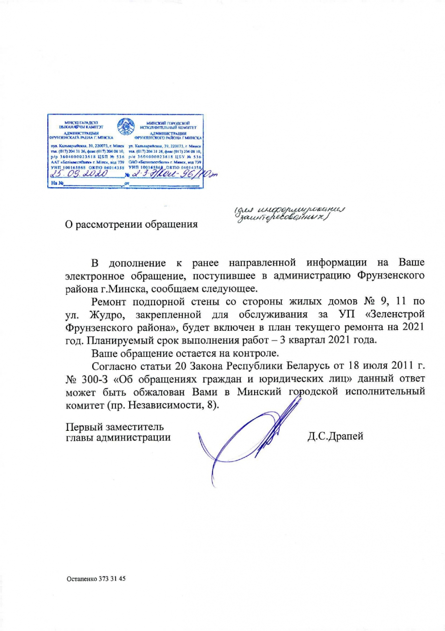 UPD. Ремонт подпорной стены со стороны жилых домов №№9,11 по ул.Жудро будет включён в план текущего ремонта на 2021 г. Планируемый срок выполнения работ - III квартал 2021 г.