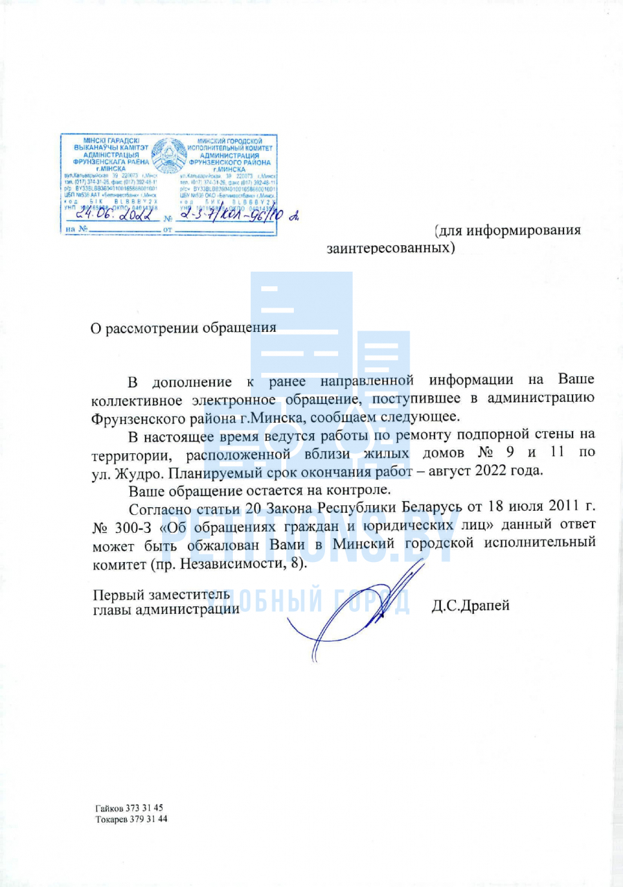 UPD 2. В настоящее время ведутся работы по ремонту подпорной стены на территории, расположенной вблизи жилых домов №9 и №11 по ул.Жудро. Планируемый срок окончания работ - август 2022 г.