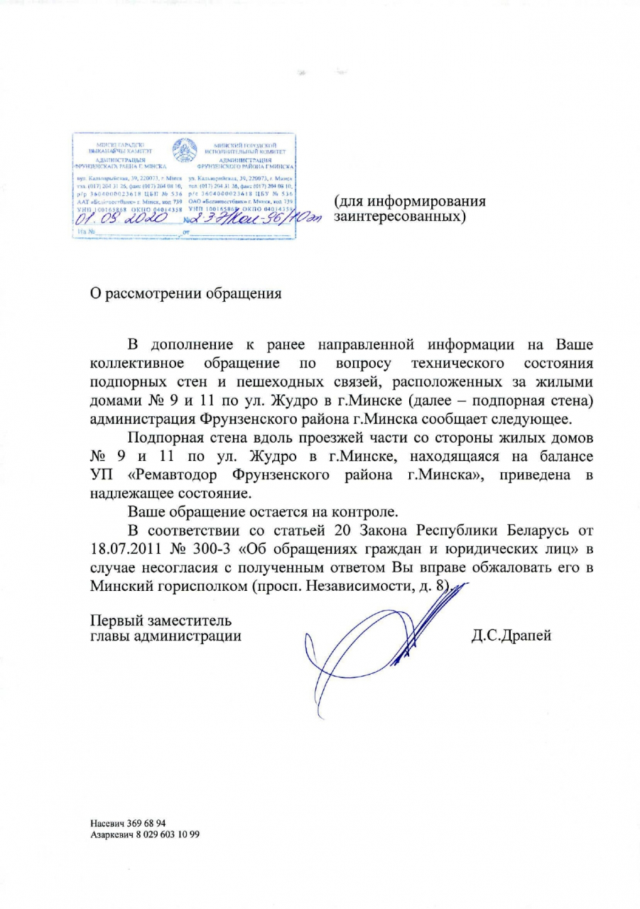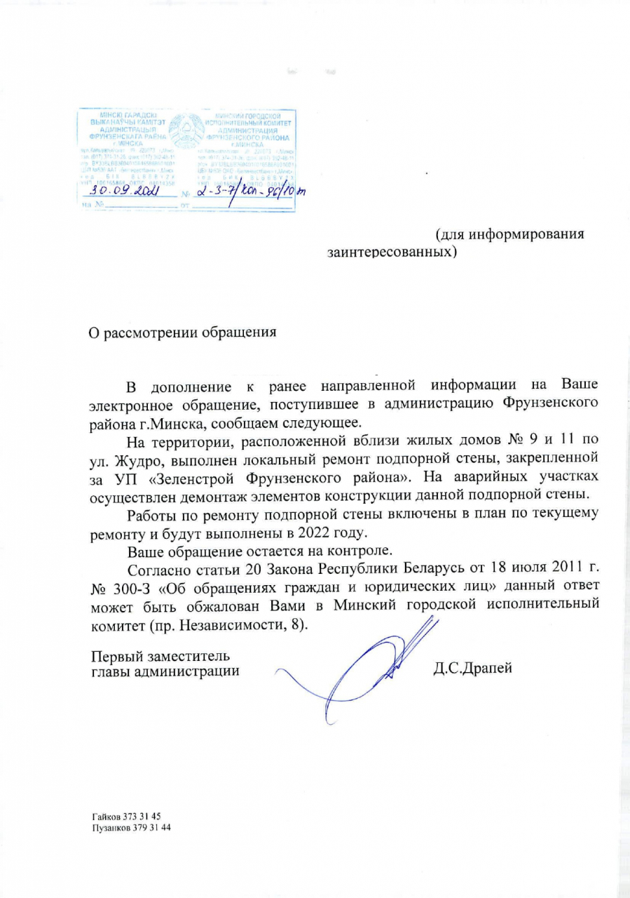 Руководствуясь ст.45 Закона "О местном управлении и самоуправлении в Республике Беларусь", которая устанавливает, что местные администрации в пределах своей компетенции в порядке, установленном законодательством, обеспечивают благоустройство и поддержание надлежащего санитарного состояния на соответствующей территории, предлагаем организовать ремонт подпорных стен и пешеходных связей, расположенных за жилыми домами №9 и №11 по ул.Жудро, по причинам наличия многочисленных дефектов в виде: