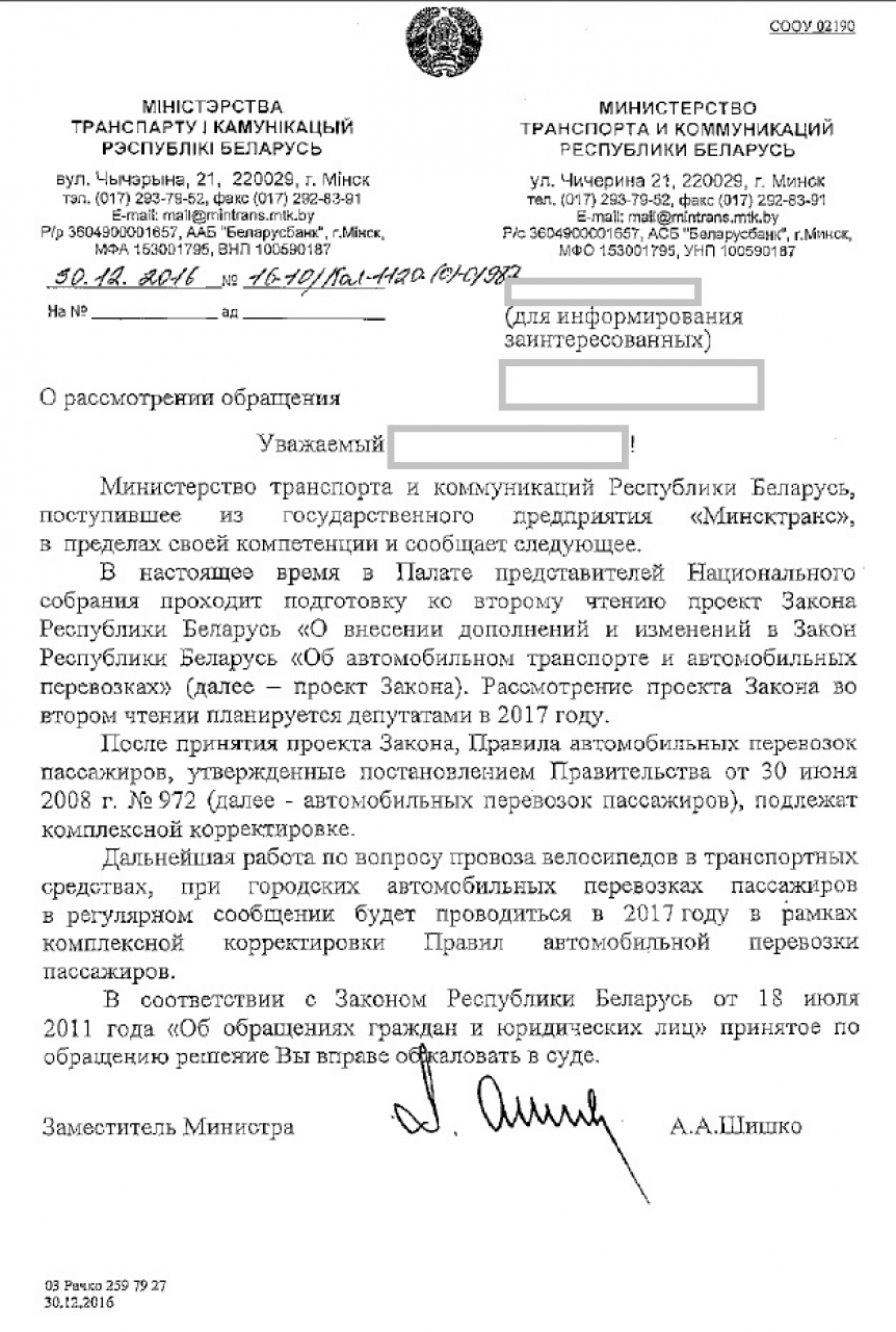С целью улучшения качества работы транспортной системы Минска в целом и учитывая, что случаи, в которых требуется перевозка велосипеда, редки, просим разрешить явным образом перевозку велосипеда в городском транспорте (возможно, ограничив временем вне часа пик) на накопительной площадке.