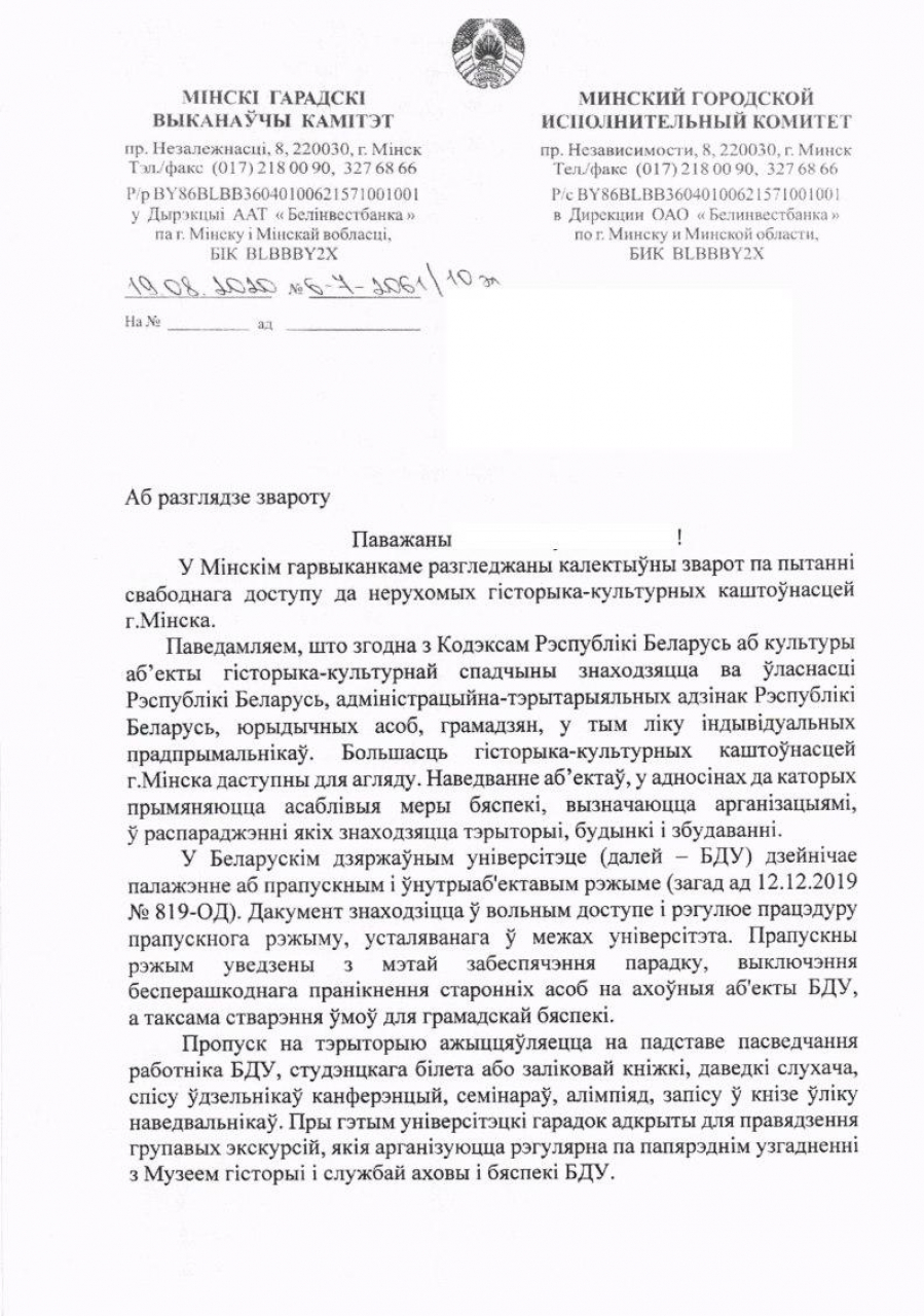 Просім забяспечыць свабодны доступ грамадзян да гісторыка-культурных каштоўнасцей ва ўнутраным двары БДУ, а таксама праверыць магчымаць доступу да ГКК на тэрыторыях іншых навучальных устаноў і “рэжымных” аб’ектаў Мінска. Спіс з днямі свабоднага наведвання гэтых аб’ектаў на бліжэйшыя 10 гадоў просім змясцісць на сайце гарвыканкама.