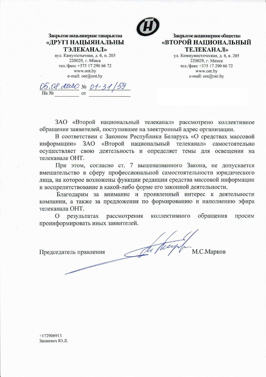 ЗАО "Второй национальный телеканал" самостоятельно осуществляет свою деятельность и определяет темы для освещения на телеканале ОНТ.