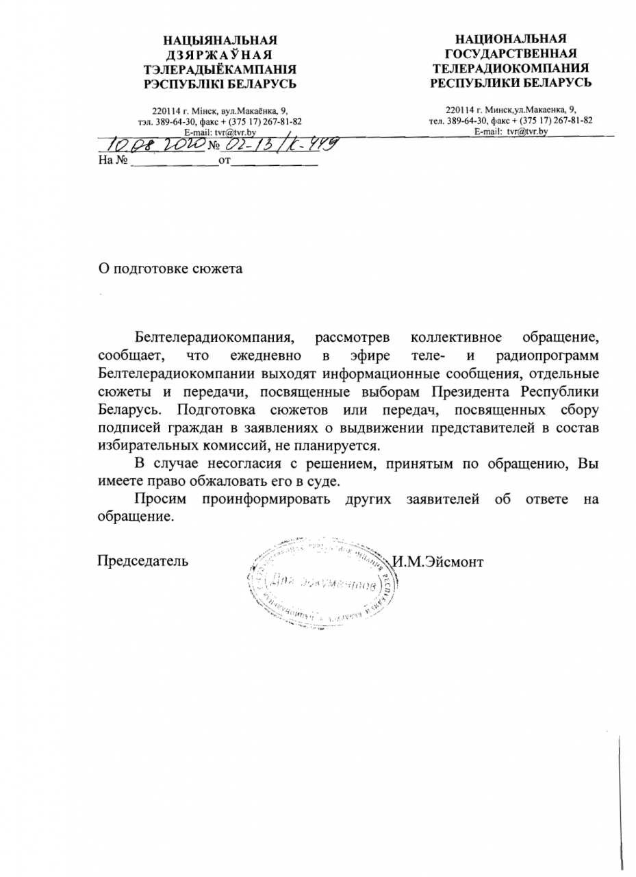 Кроме того, телевидение является основным источником передачи важной информации для заявителей настоящего обращения. Доступ к интернет-ресурсам есть не у всех жителей Республики Беларусь. Вышеописанная тема является актуальной и истребованной, информация должна дойти до нас, ход дел и их итоги нам интересен.