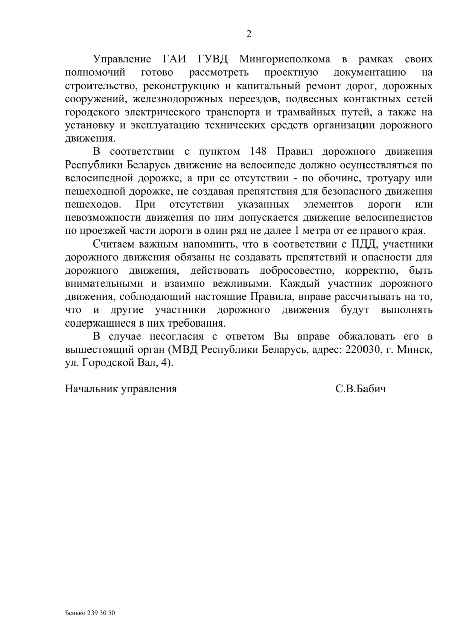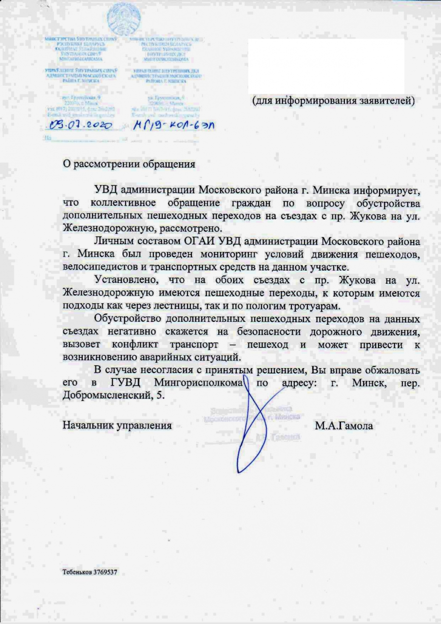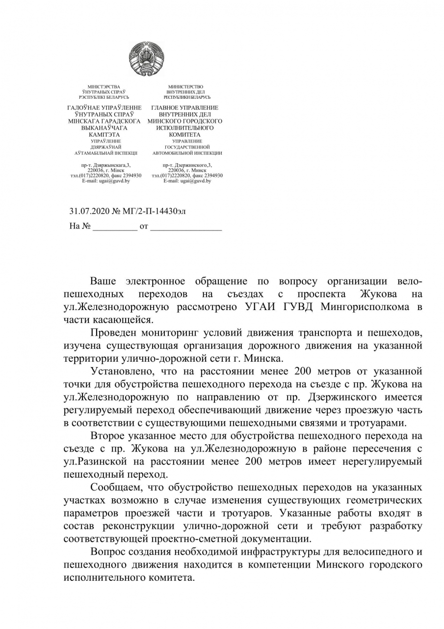 09 июля 2020 получен ответ УВД администрации Московского района г.Минска (копия прилагается) на электронное обращение об организации велопешеходного перехода на съездах с проспекта Жукова на ул.Железнодорожную. Указанный ответ считаем не соответствующим требованиям законодательства в части полного, всестороннего и объективного рассмотрения обращений и направления мотивированных и обоснованных ответов гражданам по следующим причинам: