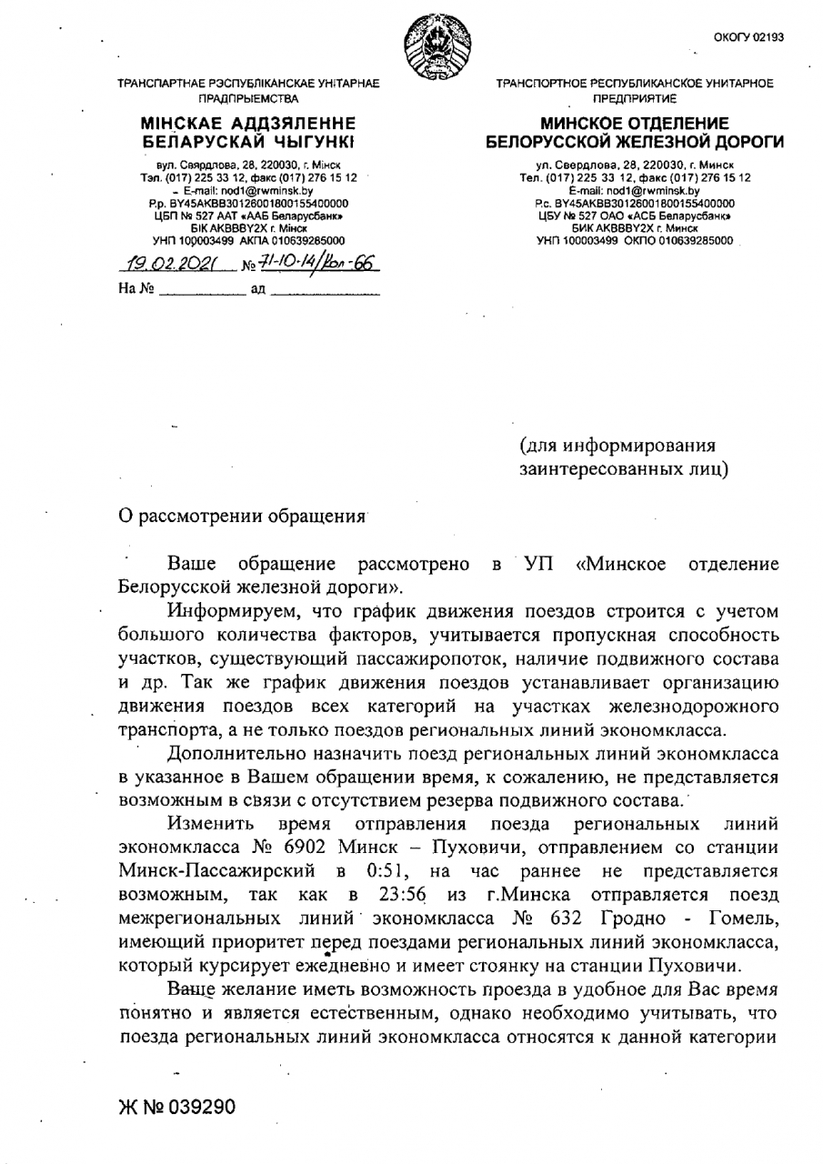 Просим вас, для удобства граждан, проживающих в Пуховичском районе, Минской области, обеспечить организацию движения дополнительного электропоезда эконом-класса, с отправлением от станции "Минск - Пассажирский" с последующими остановками, в промежутке между часами отправления электропоездов 22:49 и 00:51.
