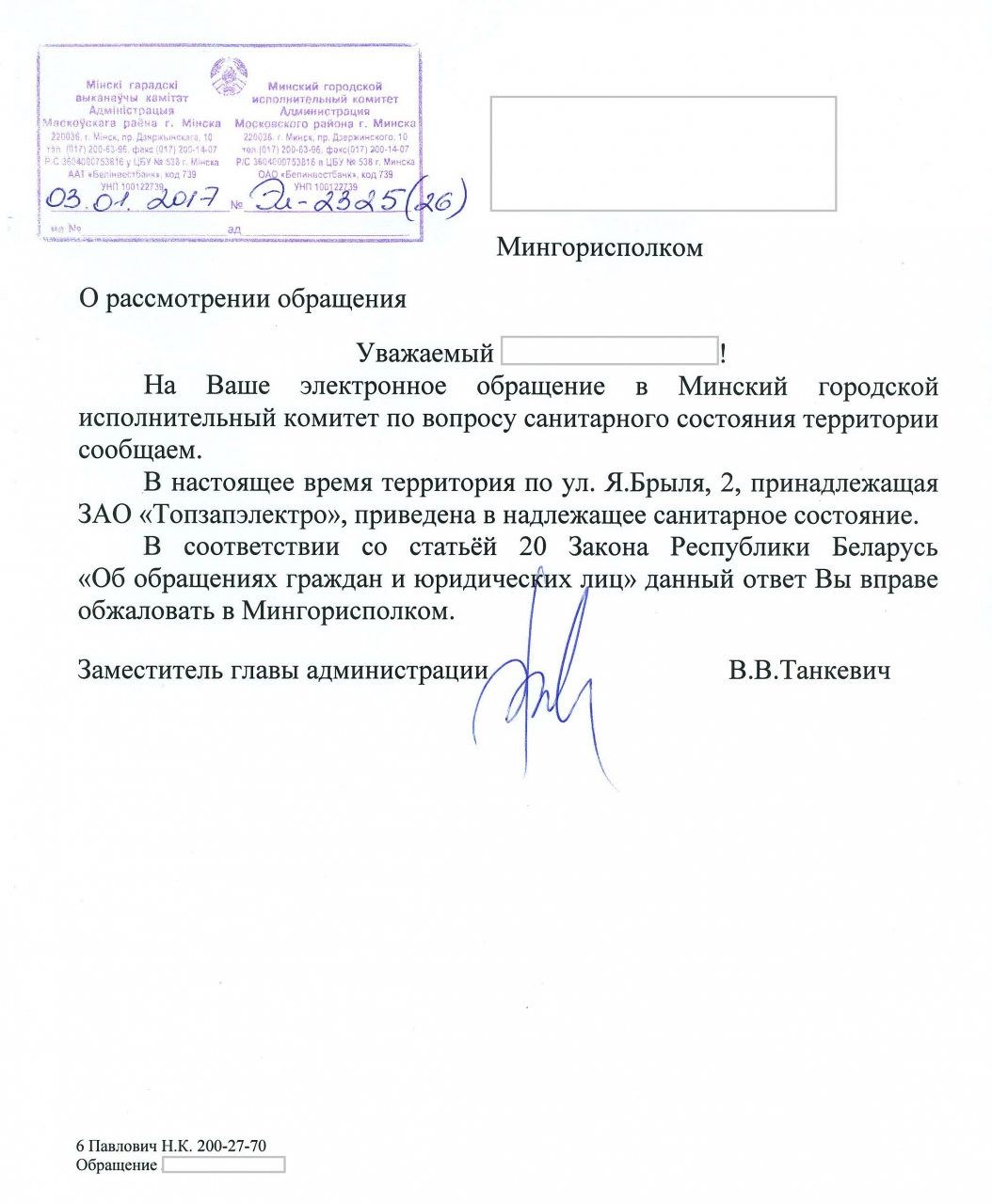 Жалоба. В связи с тем, что Решением Минского горисполкома от 05.06.2014 №1435 земельный участок с кадастровым номером 500000000005006894, на котором расположена охраняемая автостоянка по ул. Я.Брыля, 2 (№20А по генплану) предоставлен ЗАО "Топзапэлектро" на праве постоянного пользования для ее строительства и обслуживания, убедительно просим обязать ЗАО "Топзапэлектро" очистить территорию охраняемой автостоянки в границах предоставленного ЗАО "Топзапэлектро" земельного участка от строительного мусора. В дальнейшем необходимо предупредить ЗАО "Топзапэлектро" об ответственности и необходимости систематически проводить уборку вышеуказанной территории от мусора, снега и льда.